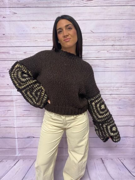 🤎 S.T.E – Maglioncino Moro Il maglioncino S.T.E. Moro è un capo dal fascino artigianale e boho-chic, perfetto per le