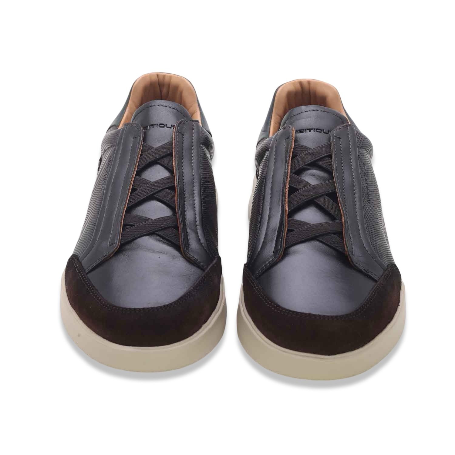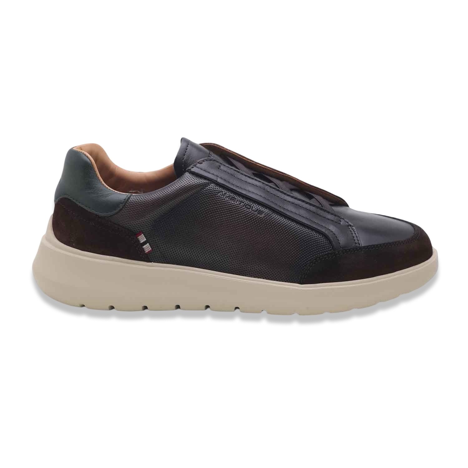 L’elastico frontale sostituisce i classici lacci, rendendo la scarpa pratica da indossare e dal look contemporaneo.