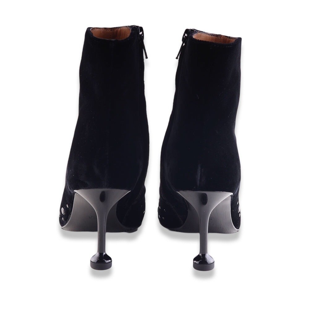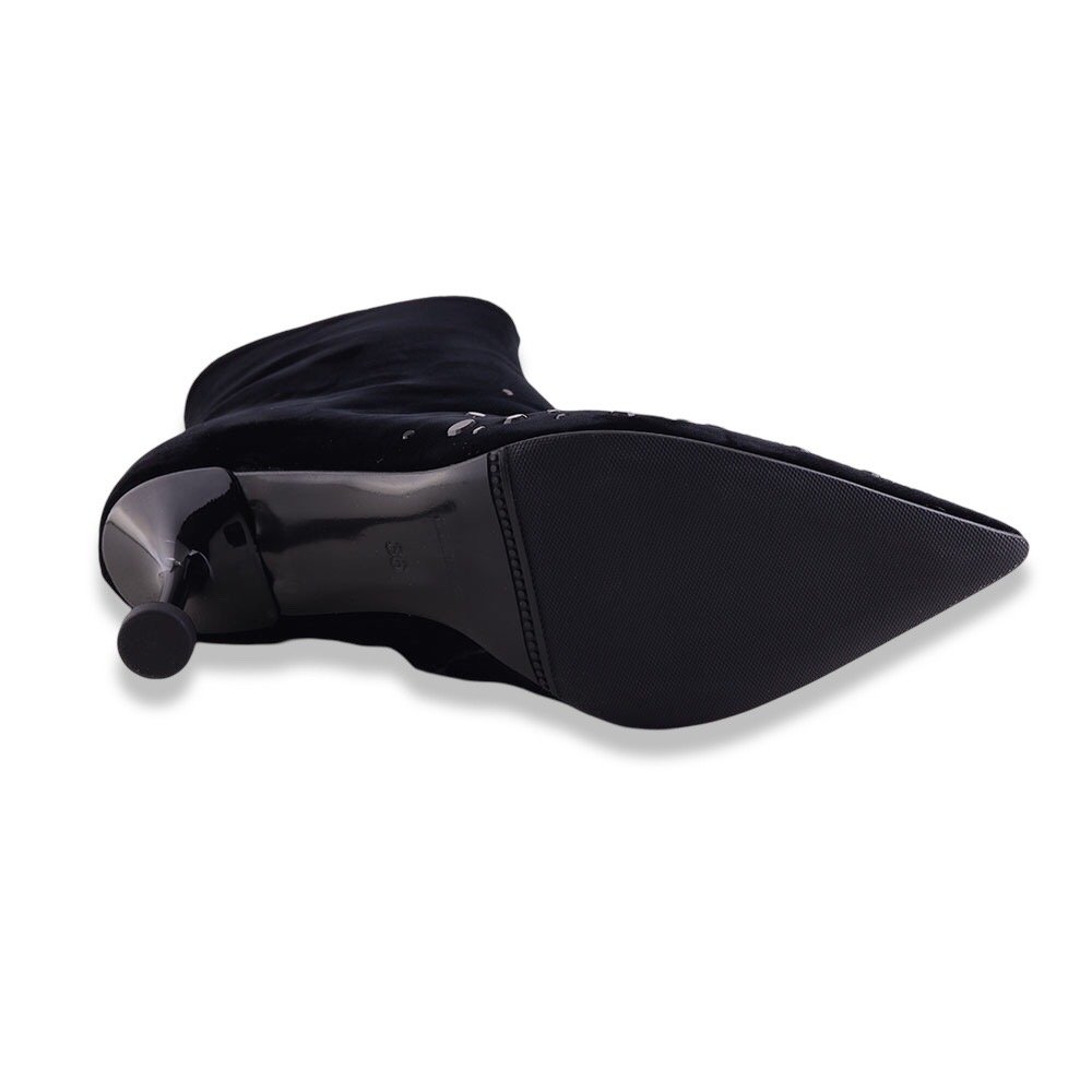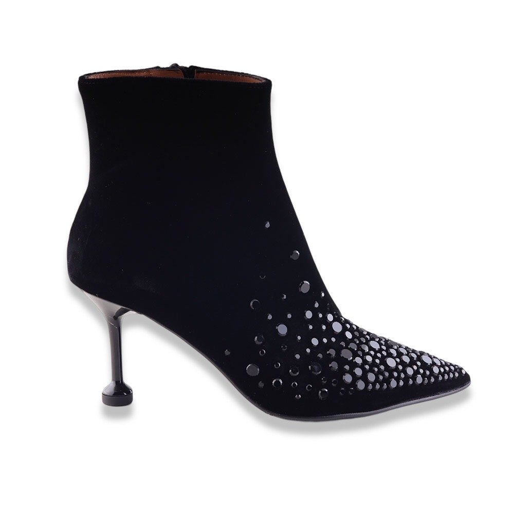 I tronchetti Belotti Chad Nero incarnano eleganza sofisticata e sensualità moderna. Realizzati in velluto nero di alta qualità, sono impreziositi da una pioggia di cristalli tono su tono che decorano la punta affusolata e si diradano verso il collo del piede, creando un effetto sfumato elegante e luminoso.
