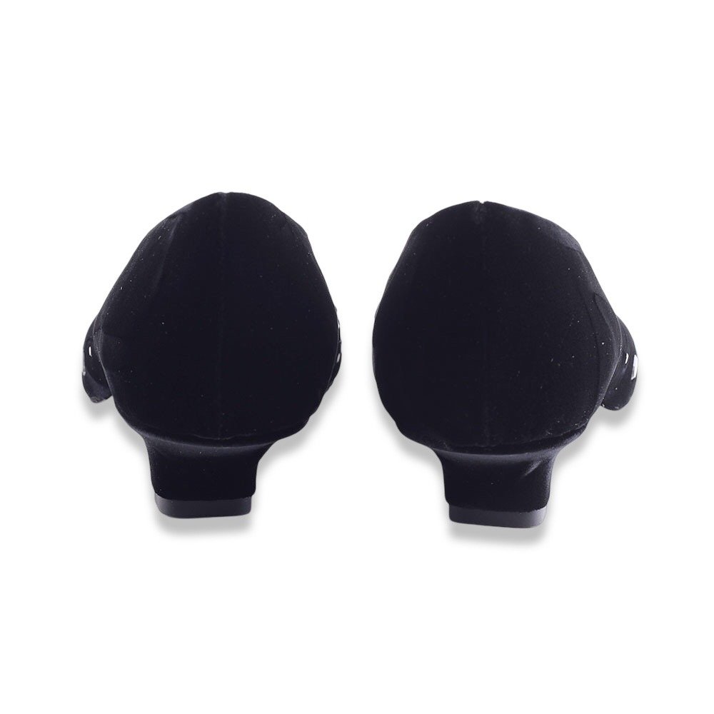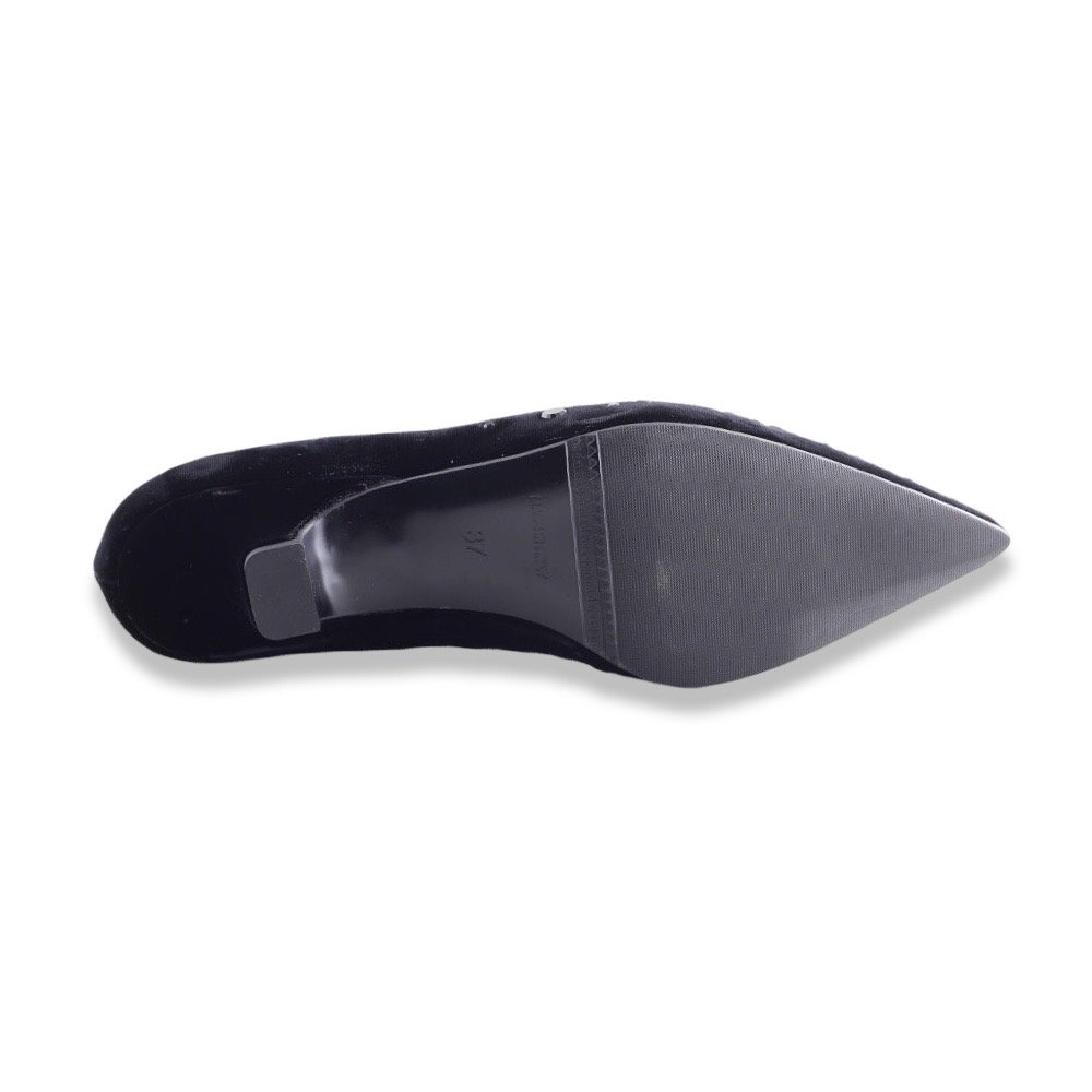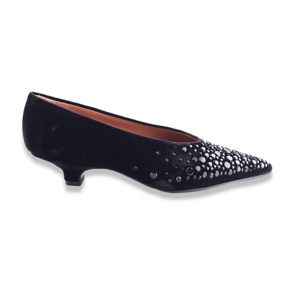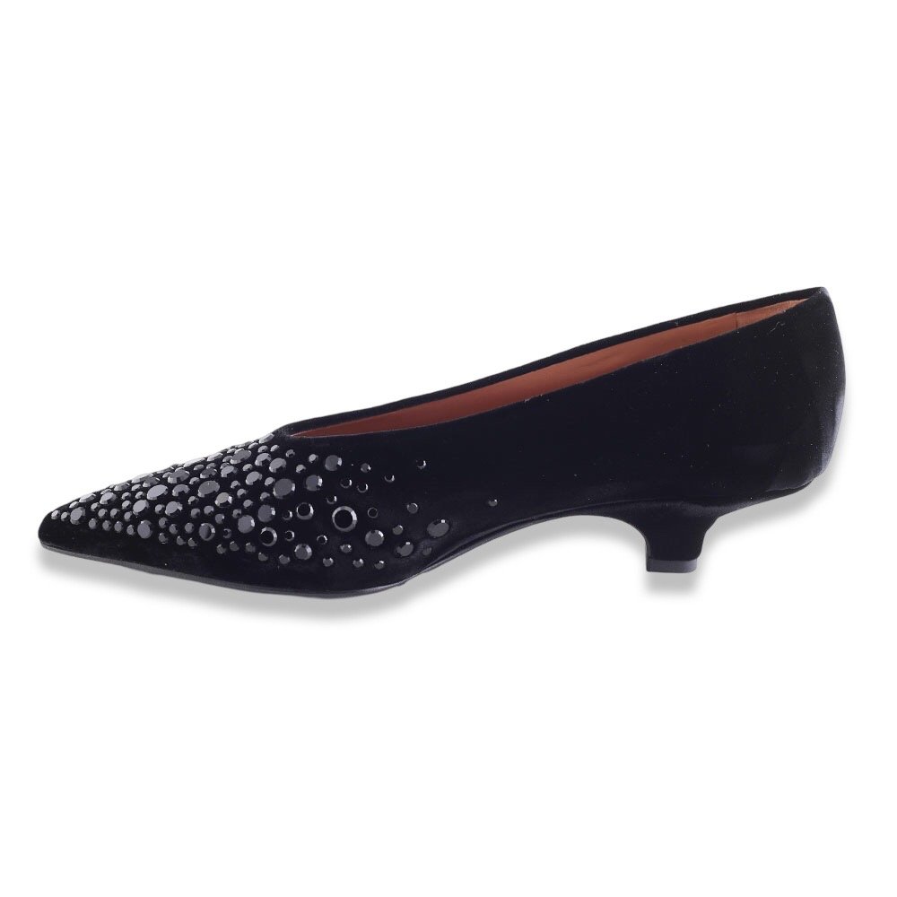 Décolleté a punta realizzate in morbido velluto nero, impreziosite da microborchie ton-sur-ton applicate a mano su tutta la parte anteriore. Il tacco basso a rocchetto dona un tocco vintage e garantisce comfort e stabilità. Un modello sofisticato e luminoso, perfetto per cerimonie serali, eventi eleganti o look da sera con un tocco glamour.