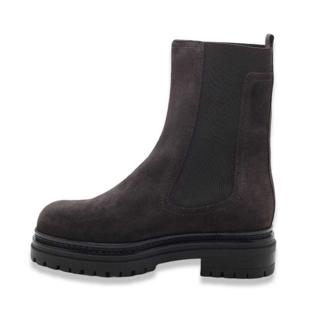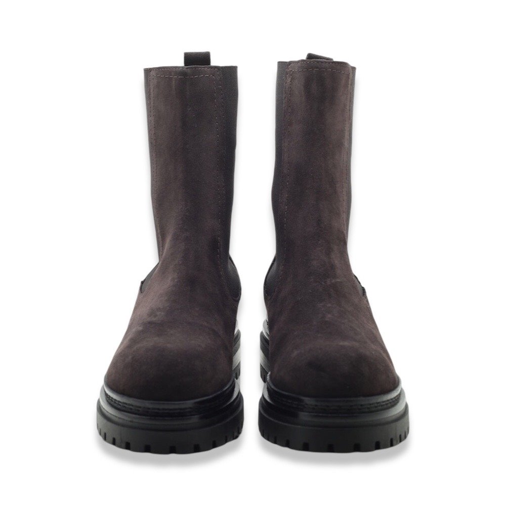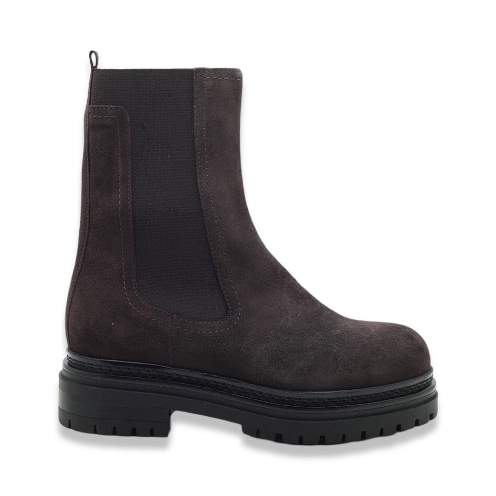 Un intramontabile modello Chelsea, rivisitato in chiave moderna. Realizzato in pelle scamosciata di alta qualità color marrone scuro, presenta gli iconici inserti elastici laterali e un pratico tirante sul retro per agevolare la calzata. La suola chunky in gomma garantisce aderenza, stabilità e comfort durante tutta la giornata, rendendo questo stivaletto perfetto sia per look casual che per outfit più eleganti.
