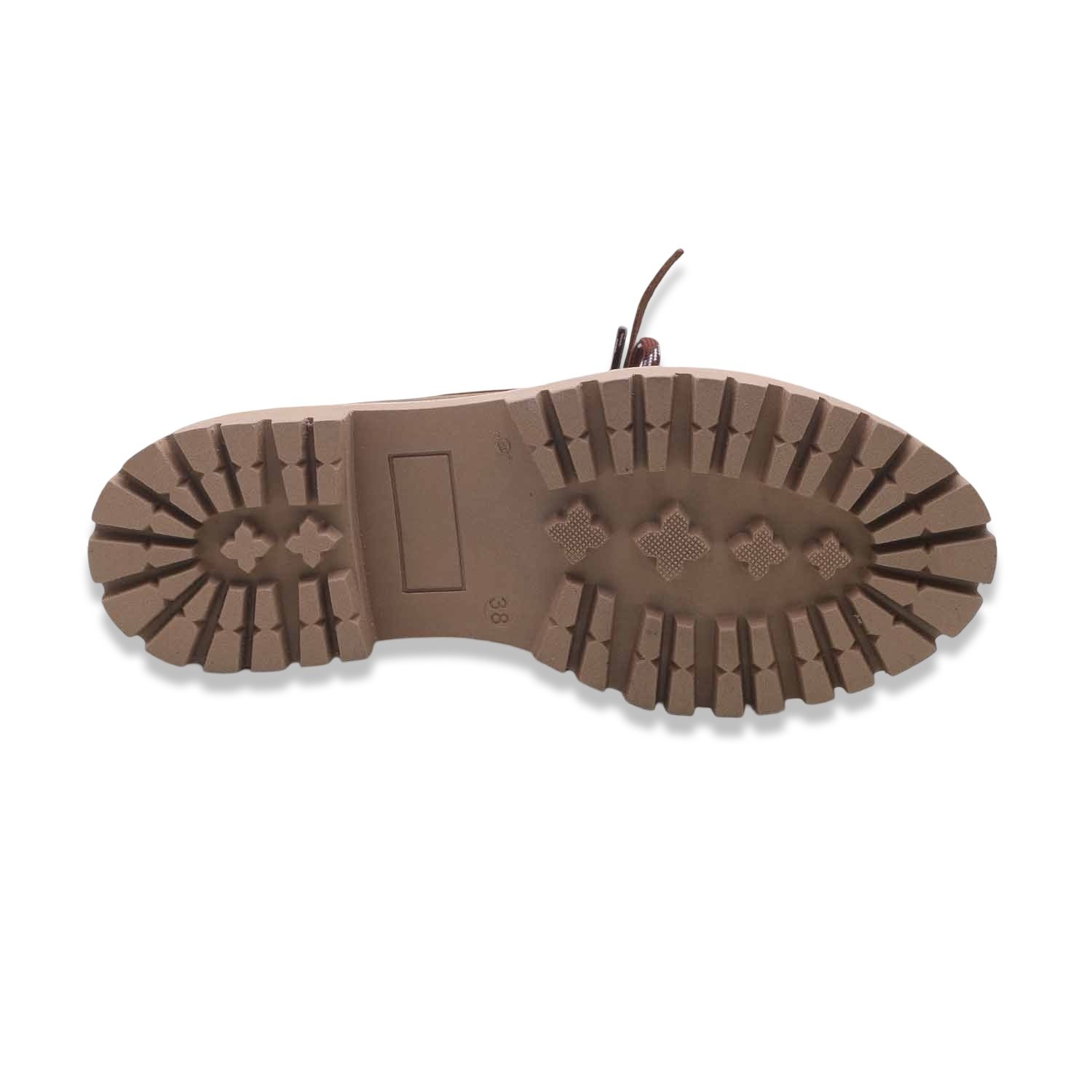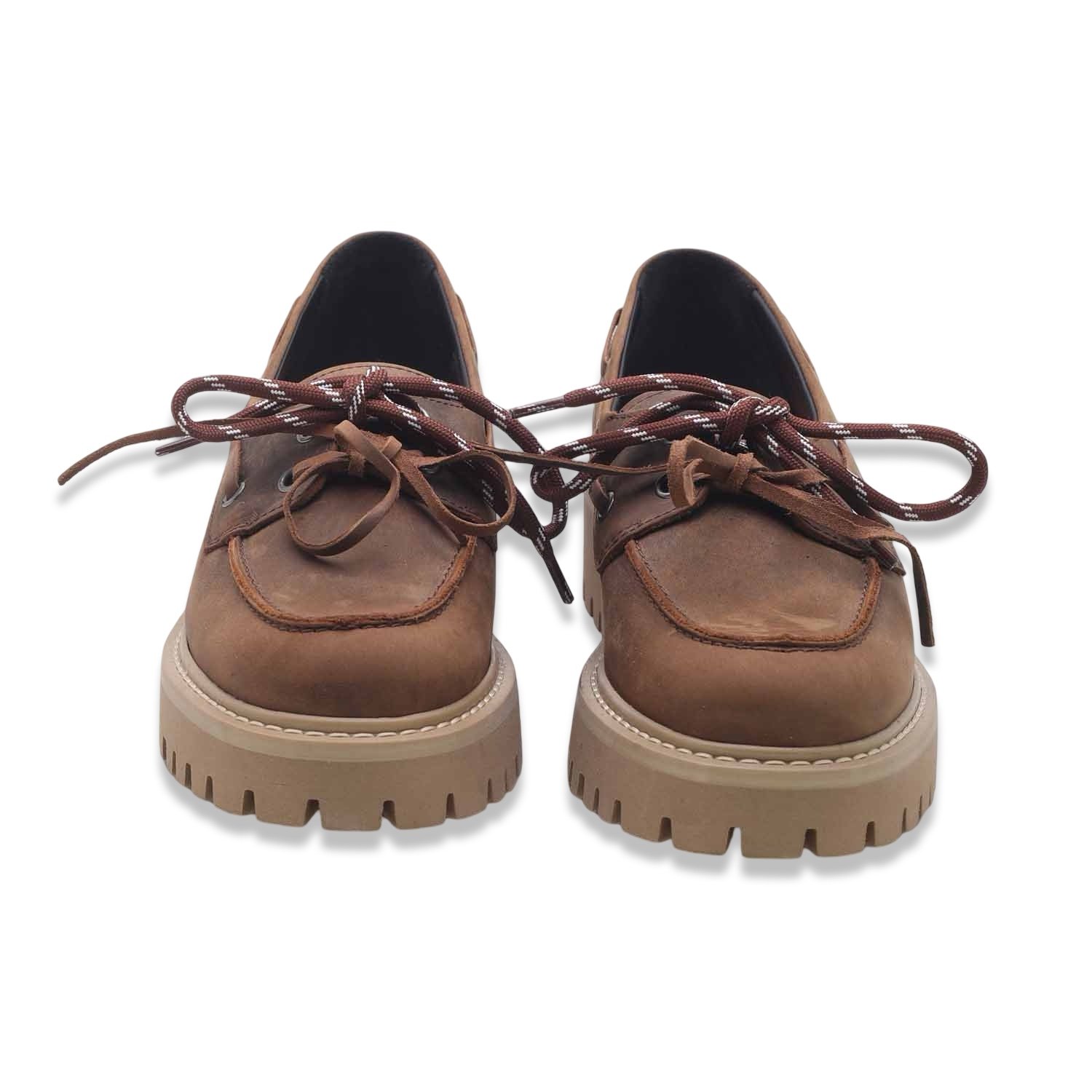 Realizzate in morbida pelle color cuoio, queste scarpe combinano dettagli iconici come i lacci intrecciati e gli occhielli metallici con una spessa suola carrarmato, perfetta per garantire stabilità e comfort in ogni occasione.