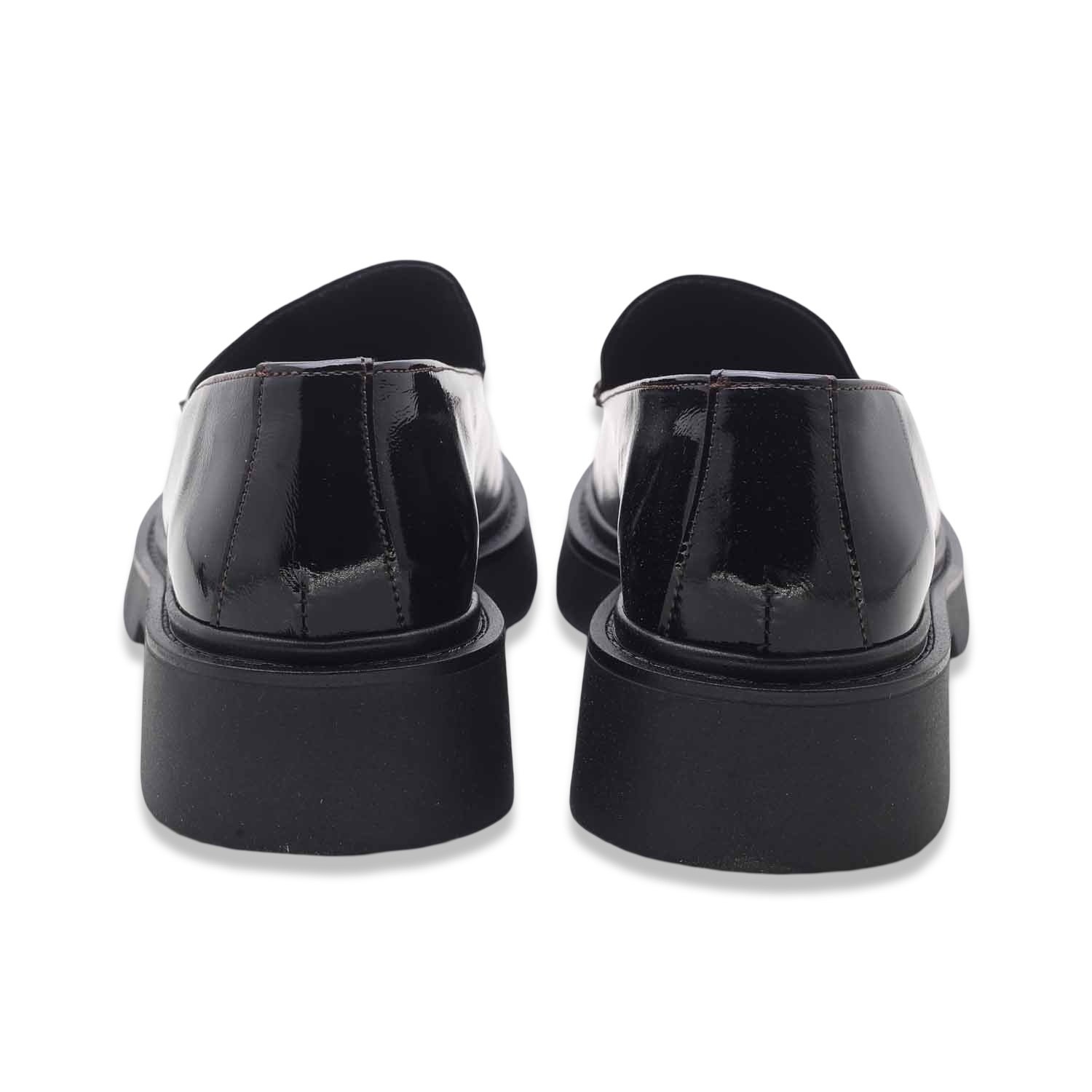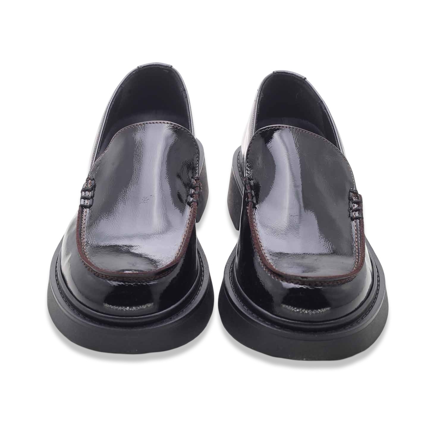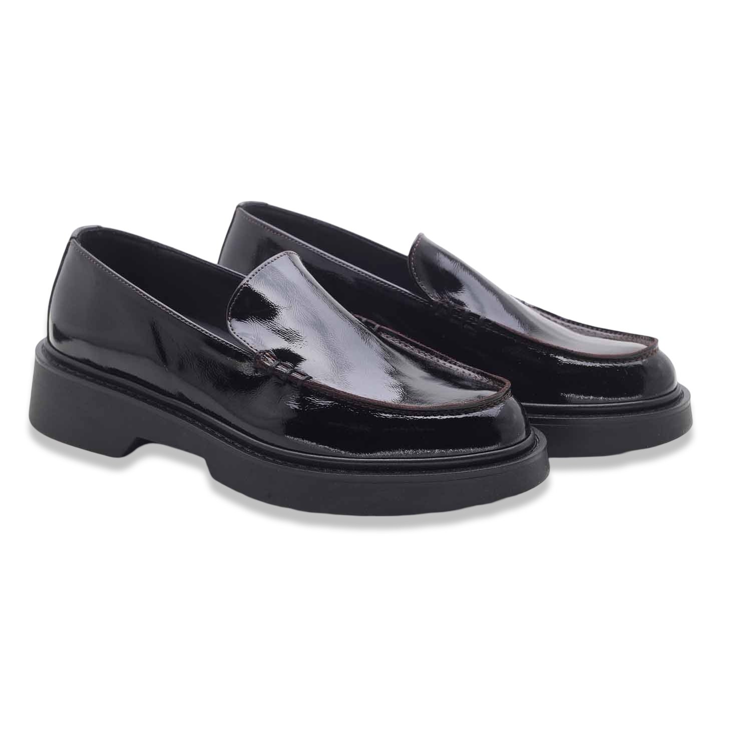 Questi mocassini, dal finish lucido effetto vernice in un elegante tono moro scuro quasi nero, hanno una linea moderna e decisa. La suola chunky in gomma nera dona stabilità e un tocco “urban chic” al modello.