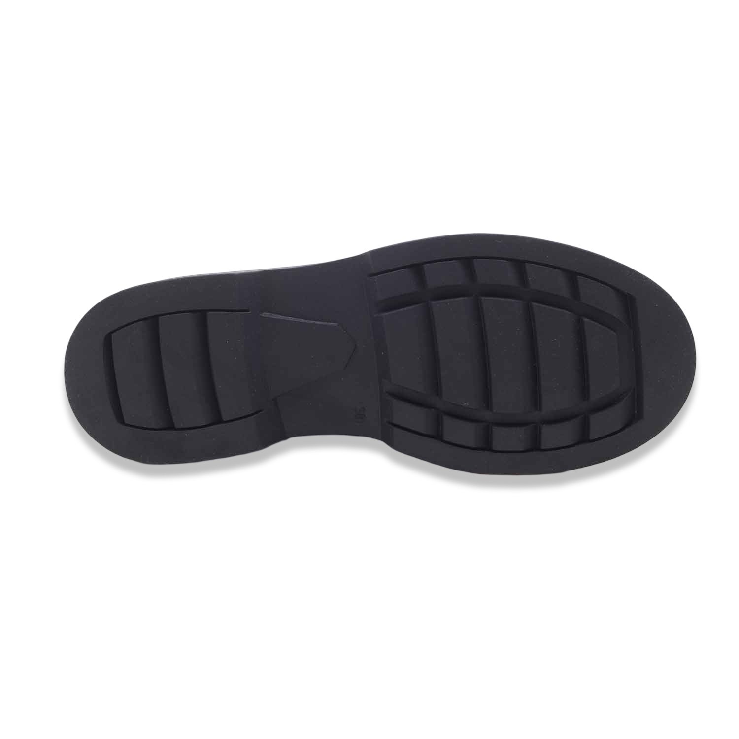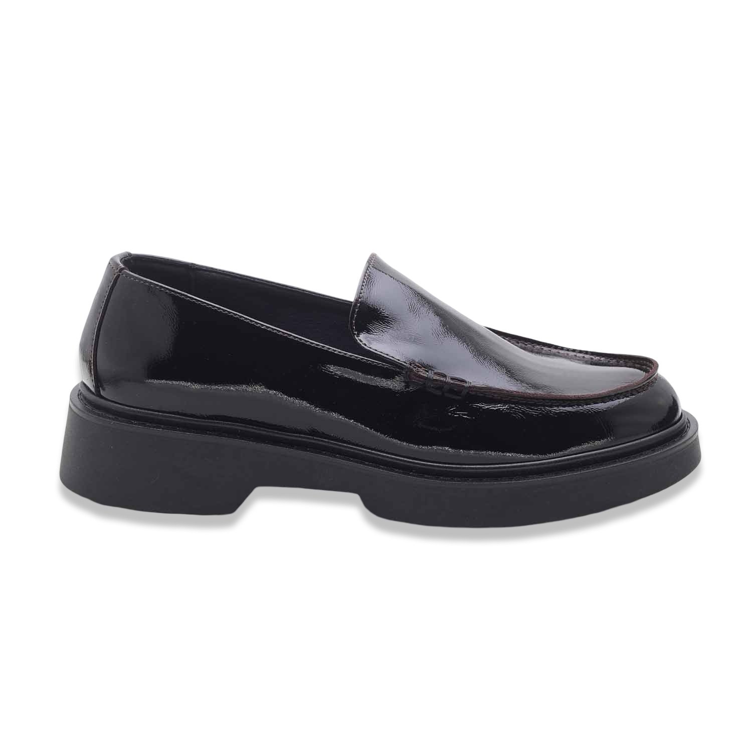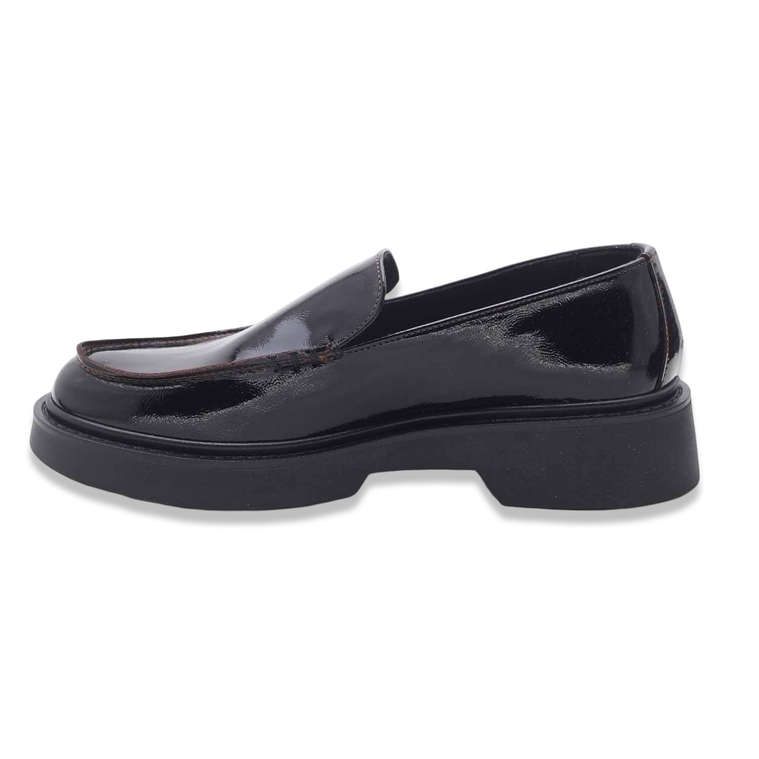 Questi mocassini, dal finish lucido effetto vernice in un elegante tono moro scuro quasi nero, hanno una linea moderna e decisa. La suola chunky in gomma nera dona stabilità e un tocco “urban chic” al modello.
