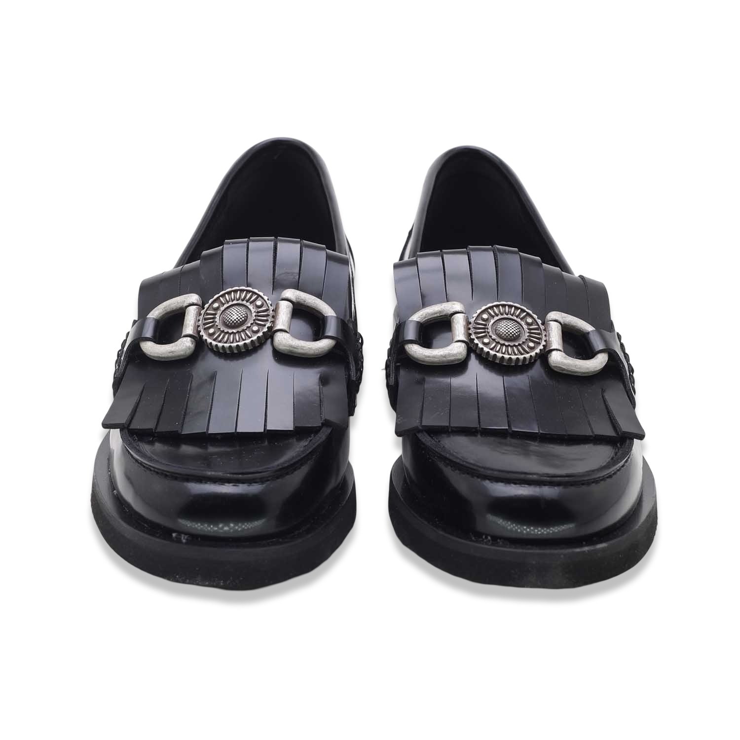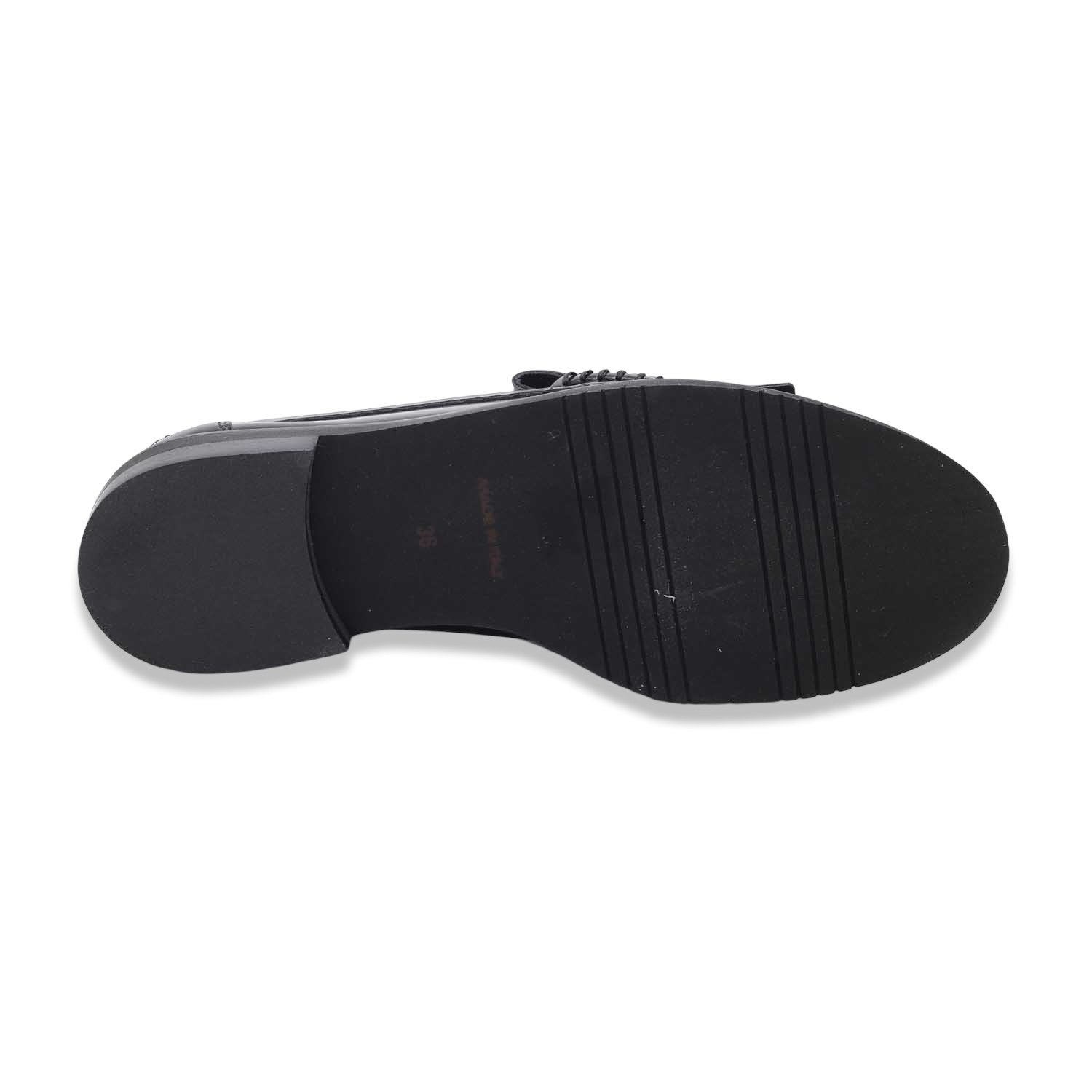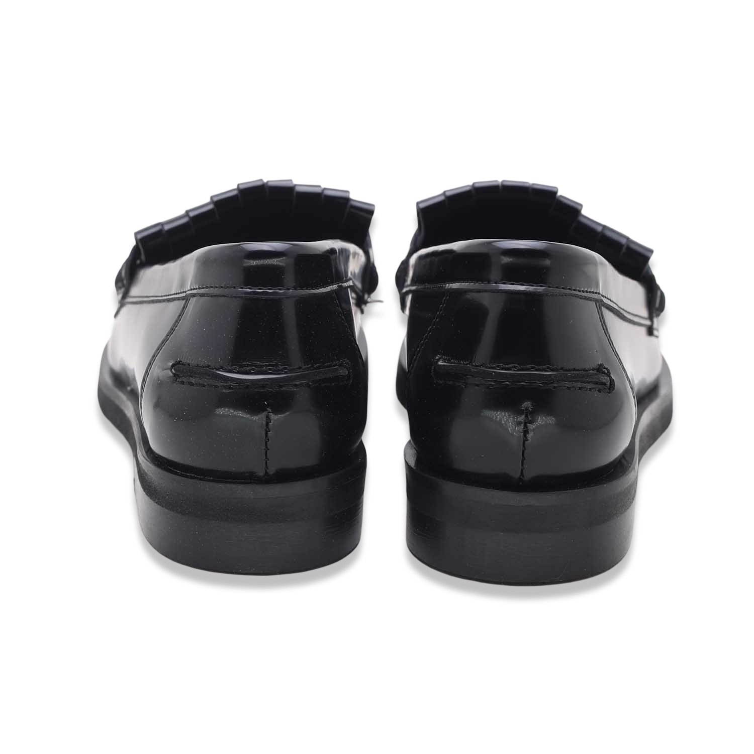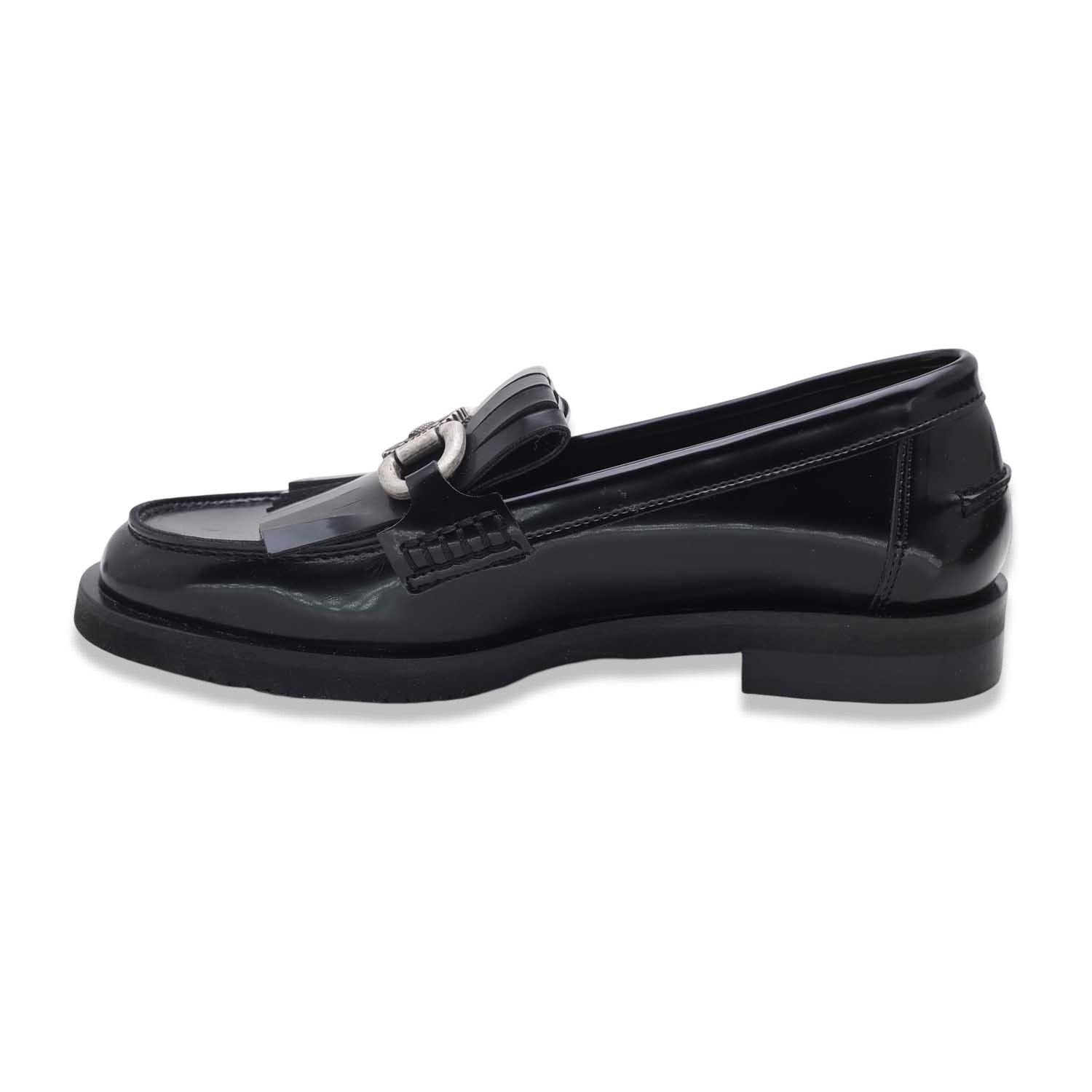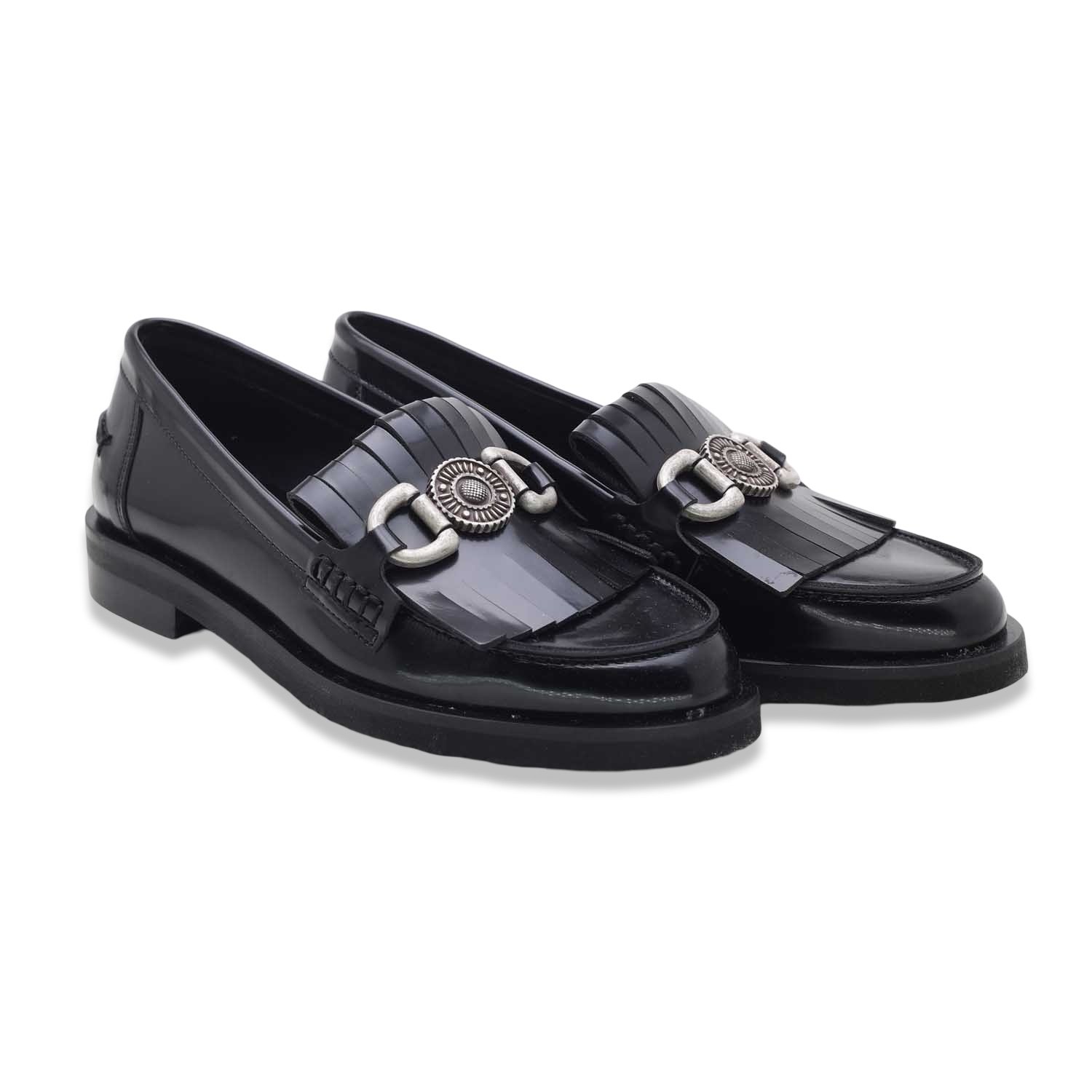 Mocassino elegante in materiale sintetico effetto spazzolato, dal colore nero. La tomaia presenta un design con frange decorative e un importante accessorio metallico color argento al centro, che aggiunge un tocco di carattere e ricercatezza.