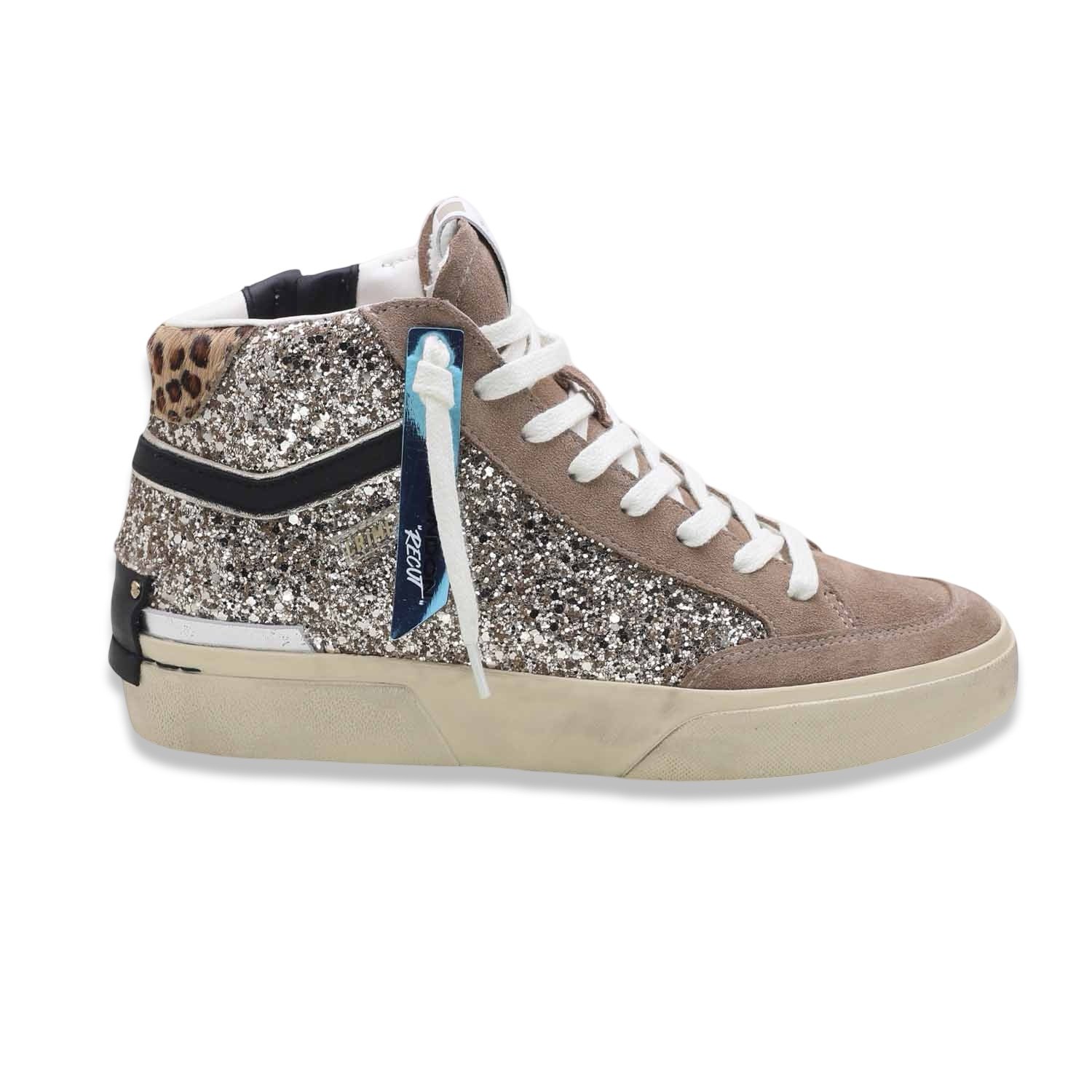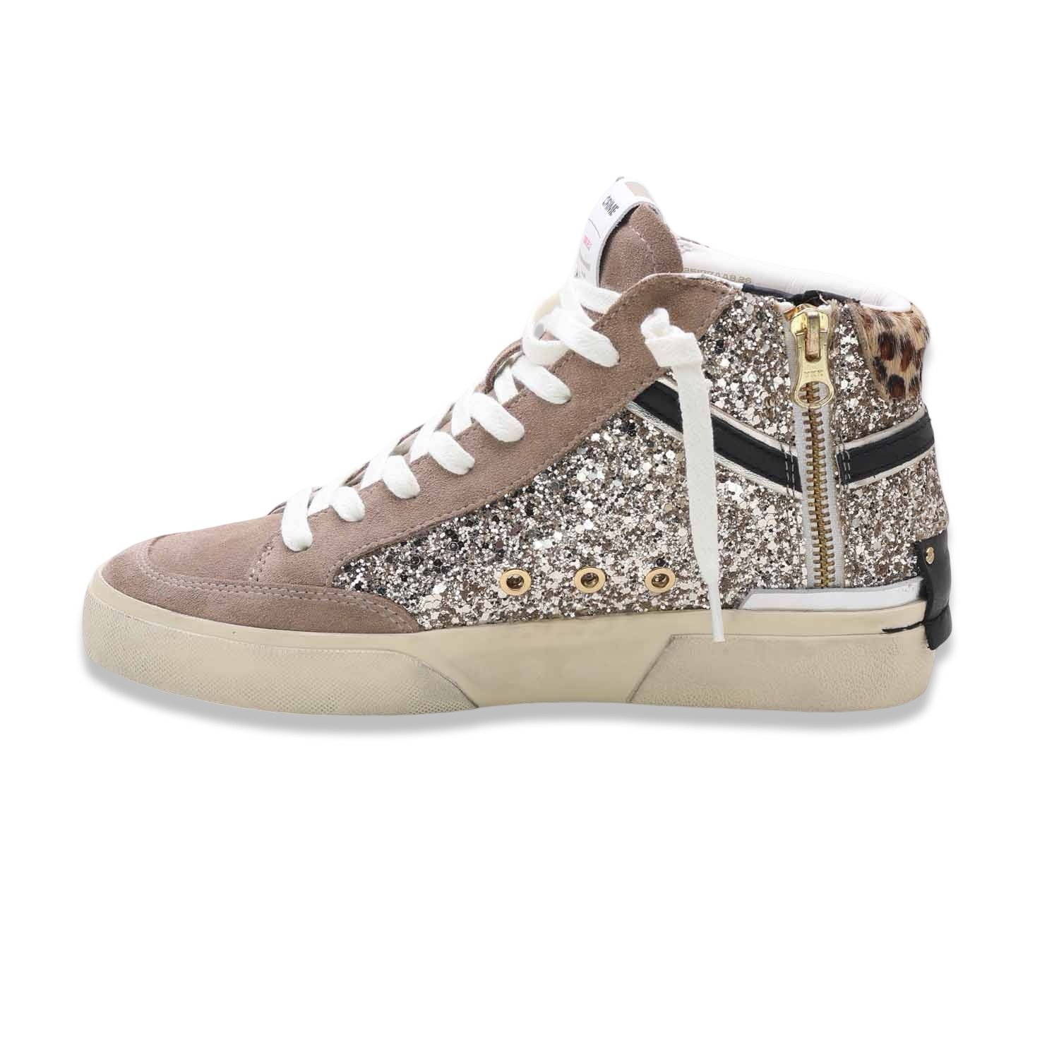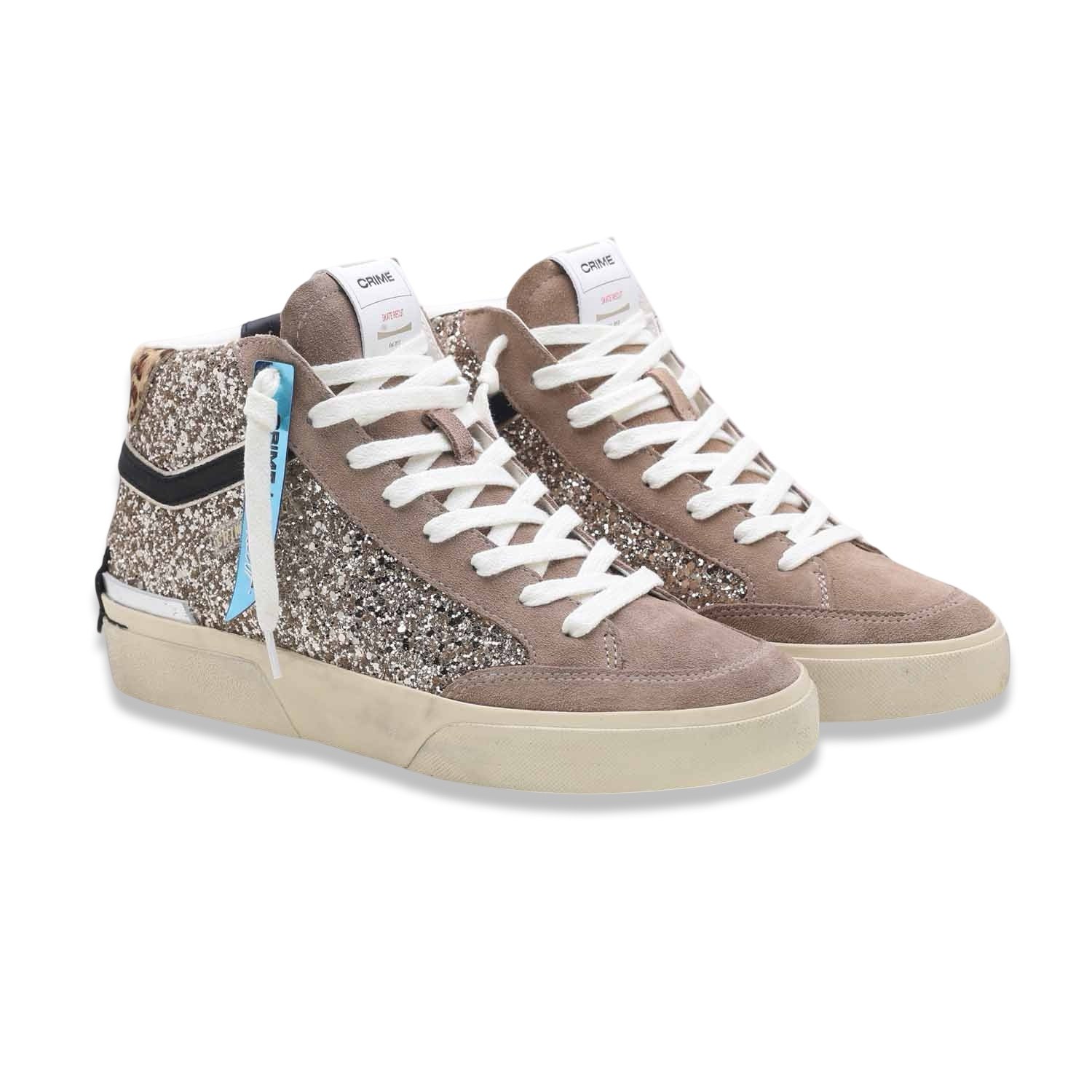 Realizzate con una raffinata combinazione di camoscio e glitter, queste sneakers high-top sono pensate per chi ama brillare senza rinunciare alla comodità.