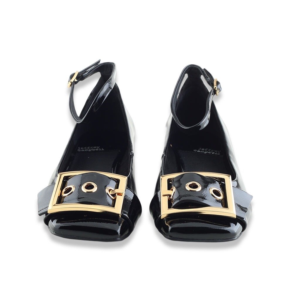 Dai un tocco regale ai tuoi look con le ballerine Luckiest Black firmate Jeffrey Campbell. Realizzate in vernice nera lucida, queste scarpe combinano eleganza classica e dettagli statement, grazie alla maxi fibbia dorata decorativa sul davanti che cattura lo sguardo.