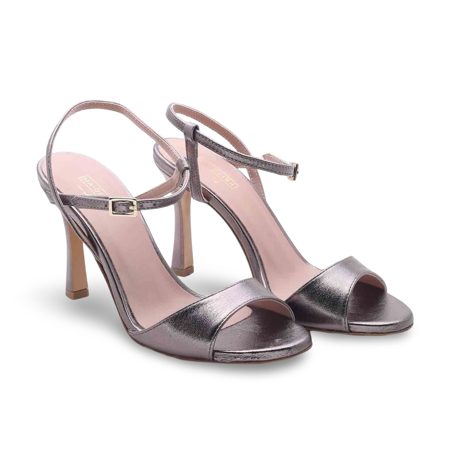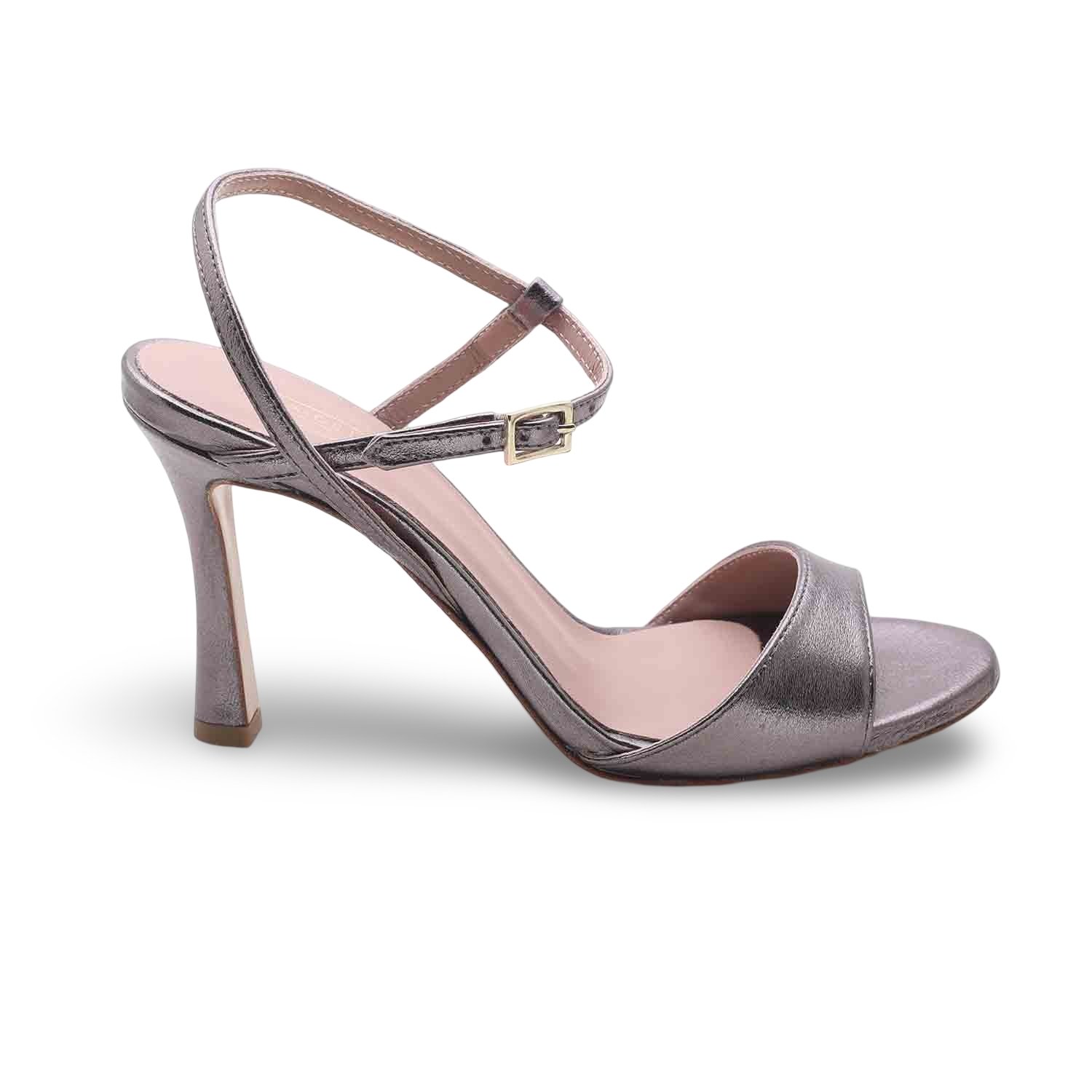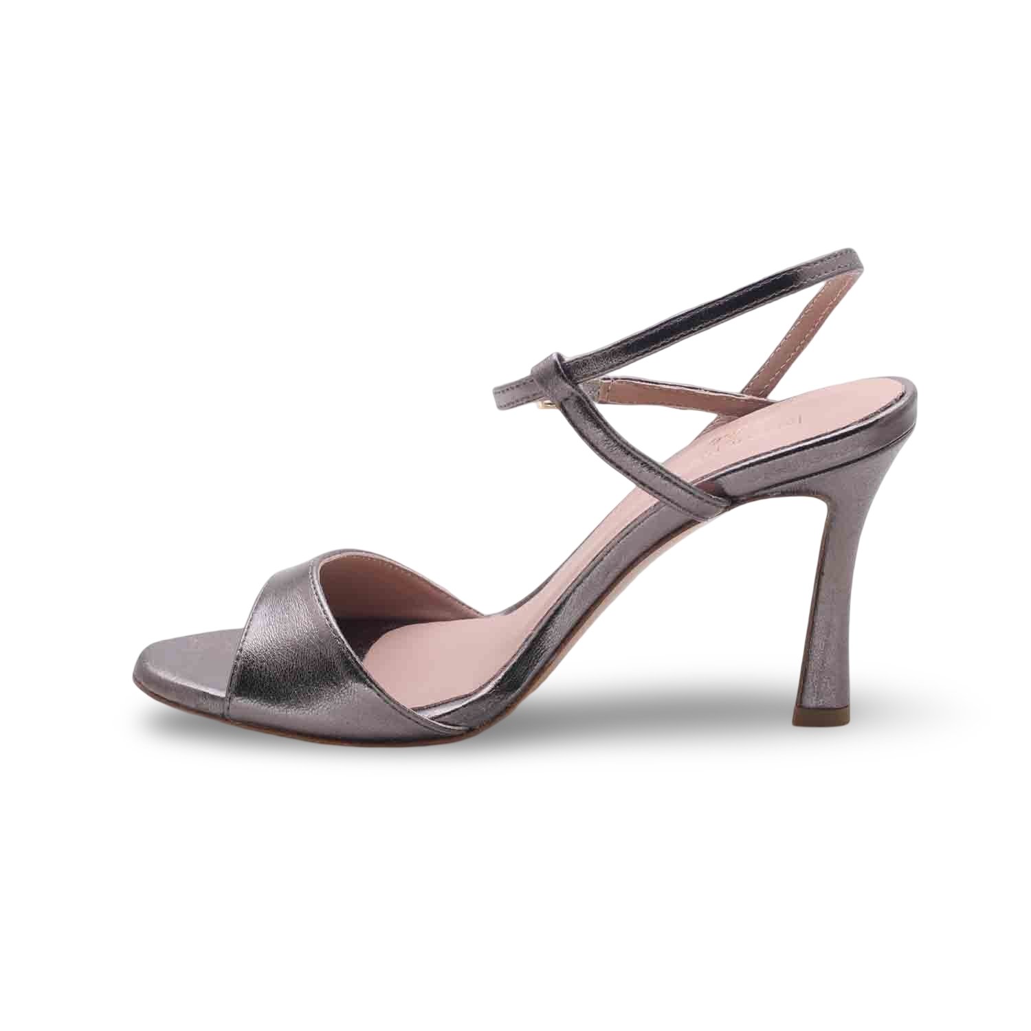 Realizzato in pelle laminata color bronzo, questo modello è caratterizzato da una silhouette minimal con cinturino alla caviglia e tacco sottile di media altezza, pensato per slanciare la figura con grazia e garantire comfort ad ogni passo. La tomaia open-toe lascia intravedere il piede con delicatezza, mentre la chiusura con fibbia regolabile assicura stabilità.
