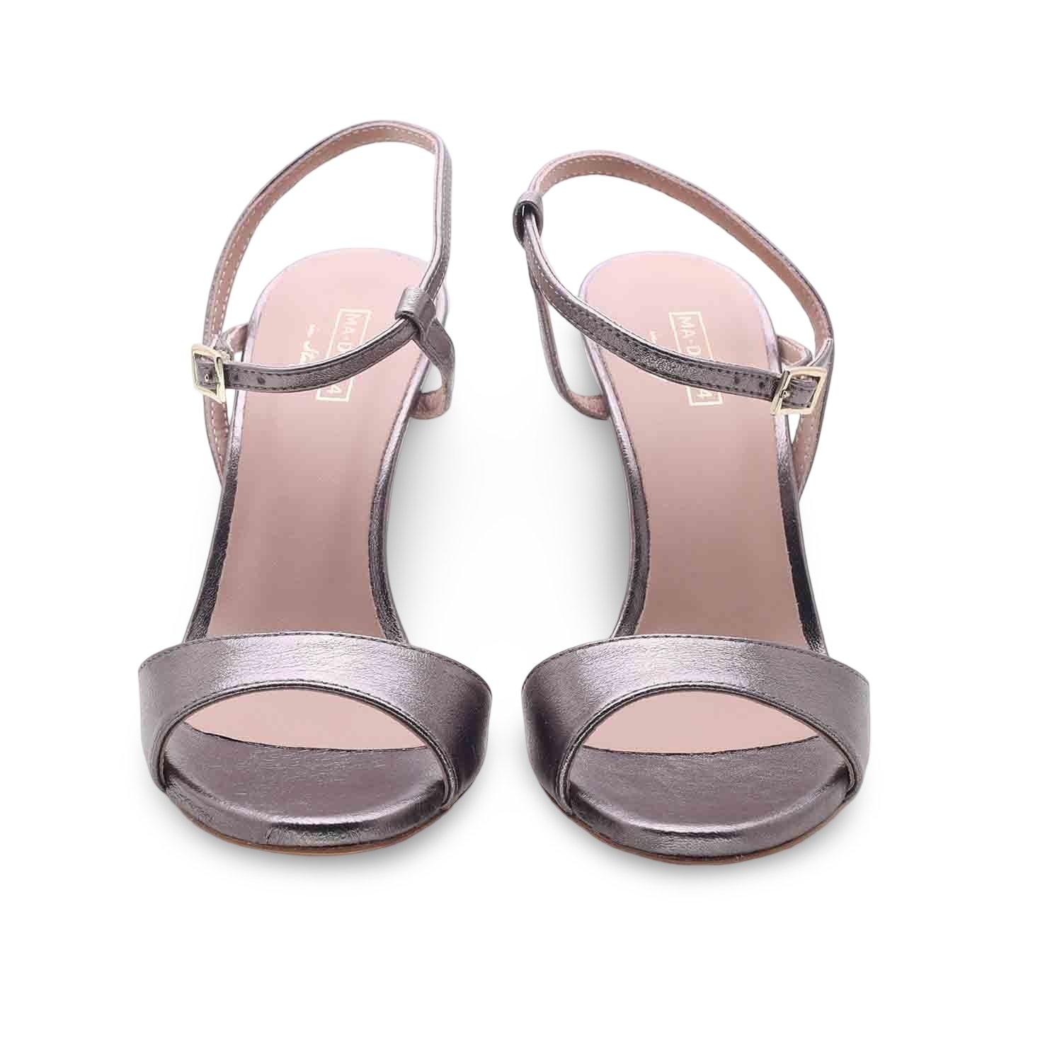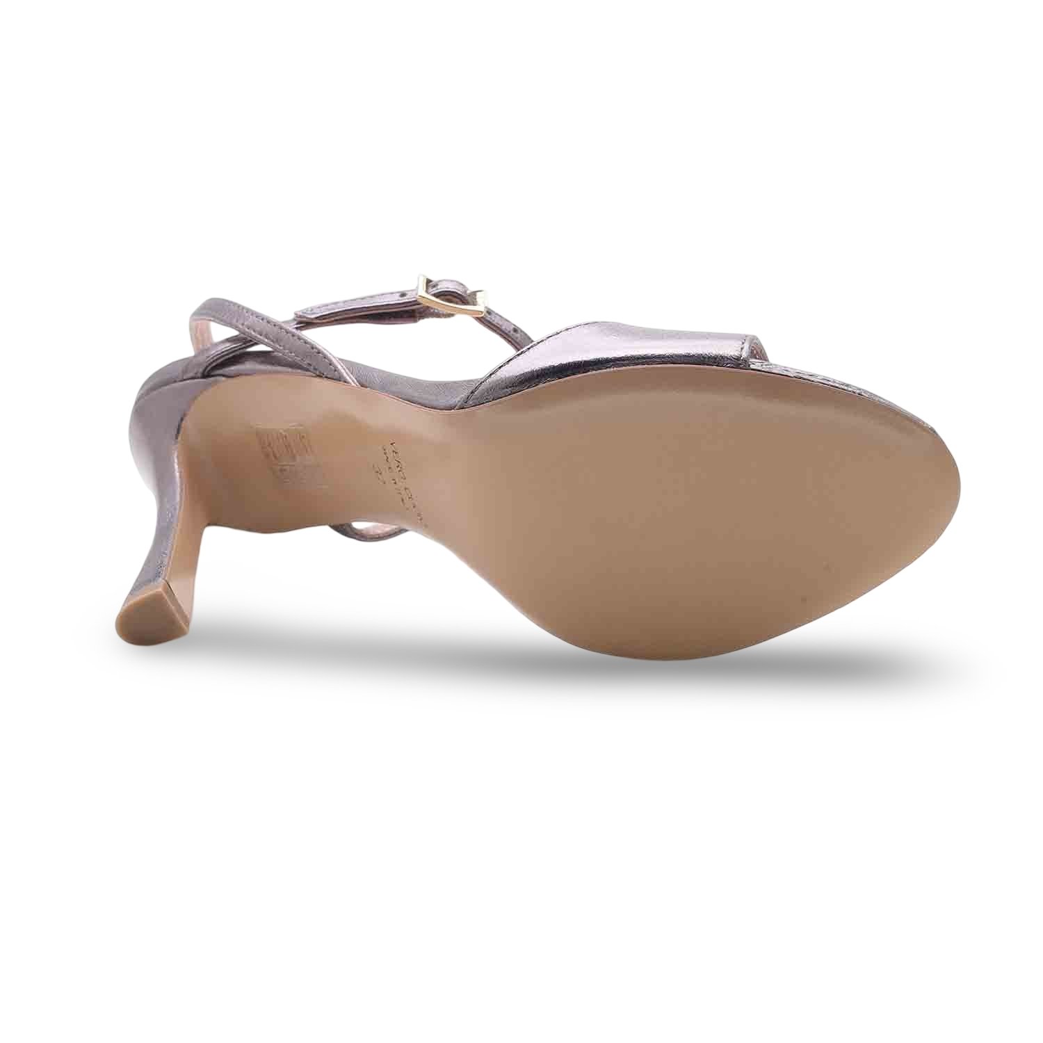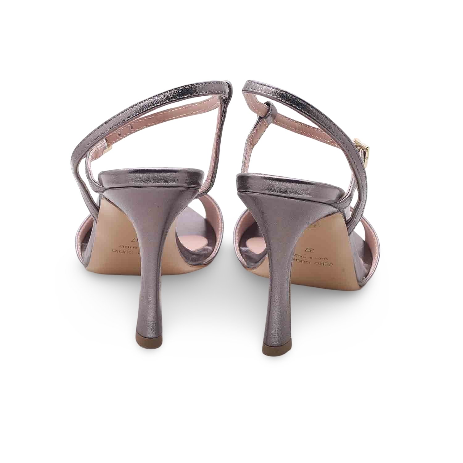 Realizzato in pelle laminata color bronzo, questo modello è caratterizzato da una silhouette minimal con cinturino alla caviglia e tacco sottile di media altezza, pensato per slanciare la figura con grazia e garantire comfort ad ogni passo. La tomaia open-toe lascia intravedere il piede con delicatezza, mentre la chiusura con fibbia regolabile assicura stabilità.