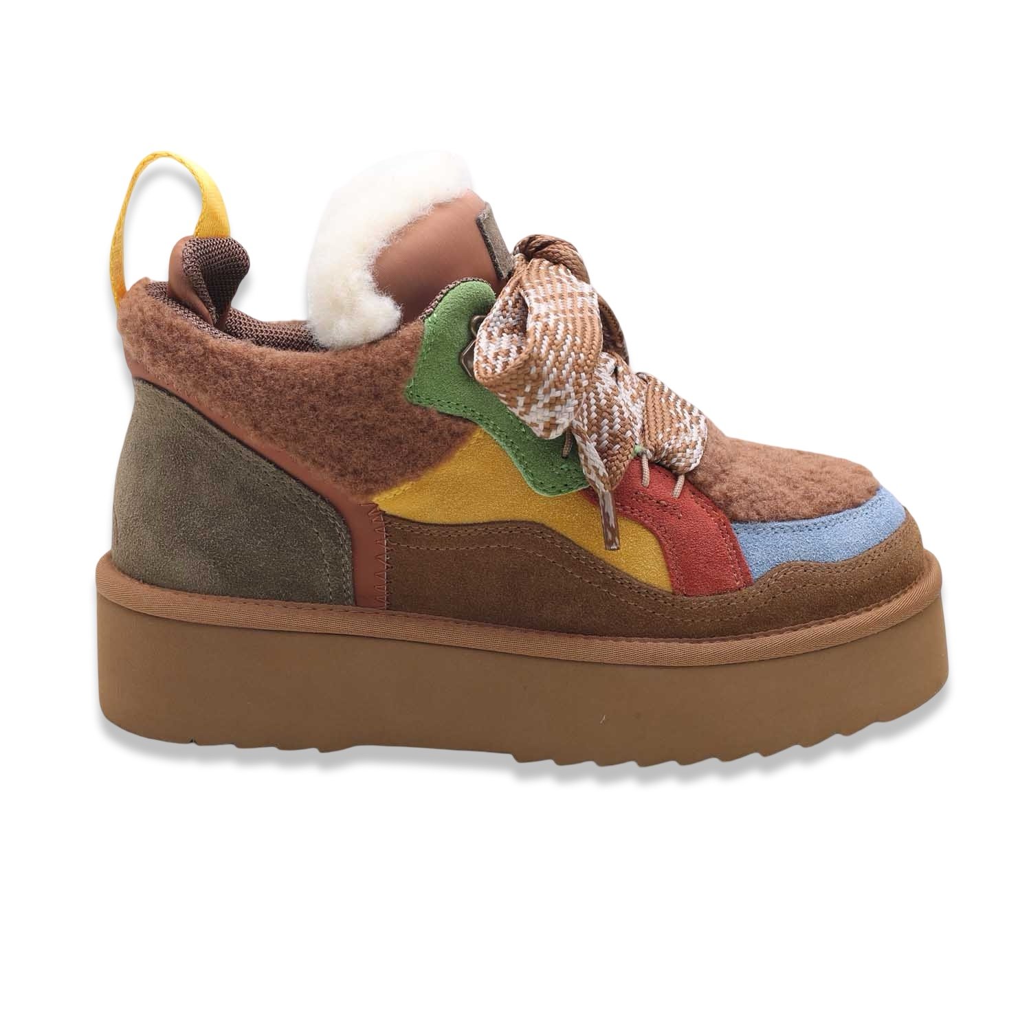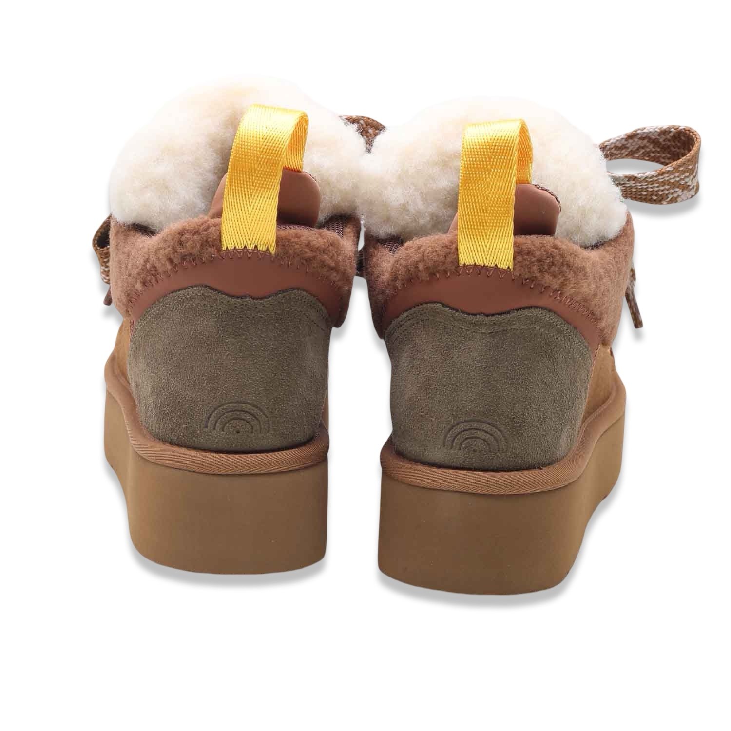 L’interno foderato in morbida eco-pelliccia avvolge il piede in un caldo abbraccio ❄️, mentre la suola platform in gomma color caramello regala altezza e comodità senza rinunciare allo stile.