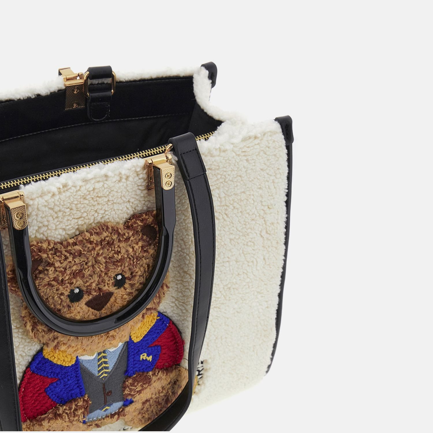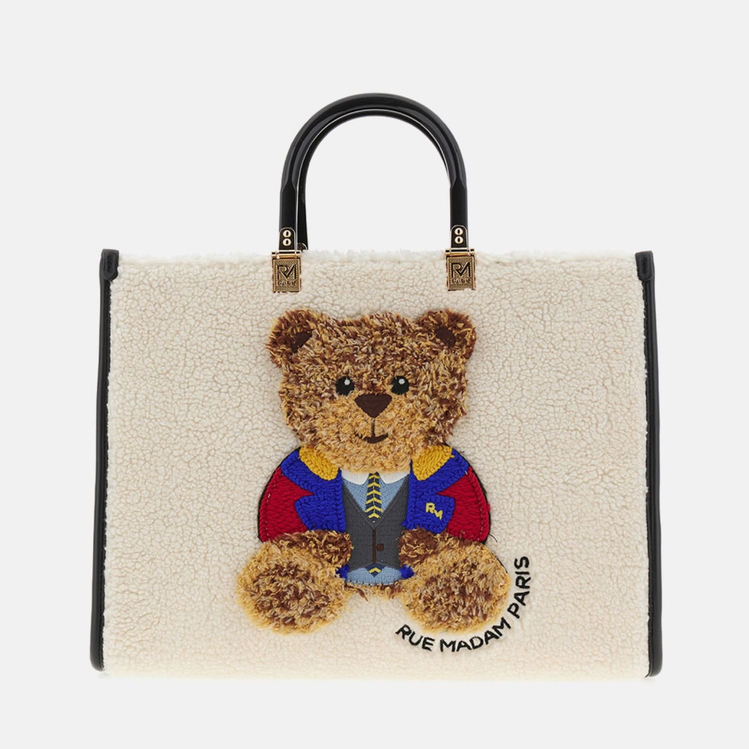 Realizzata in morbido tessuto effetto pelliccia sherpa color crema 🐑🤍, è arricchita da un maxi ricamo 3D del tenerissimo orso Marvin 🐻, icona del brand, con giacca colorata che rende la borsa unica e allegra.