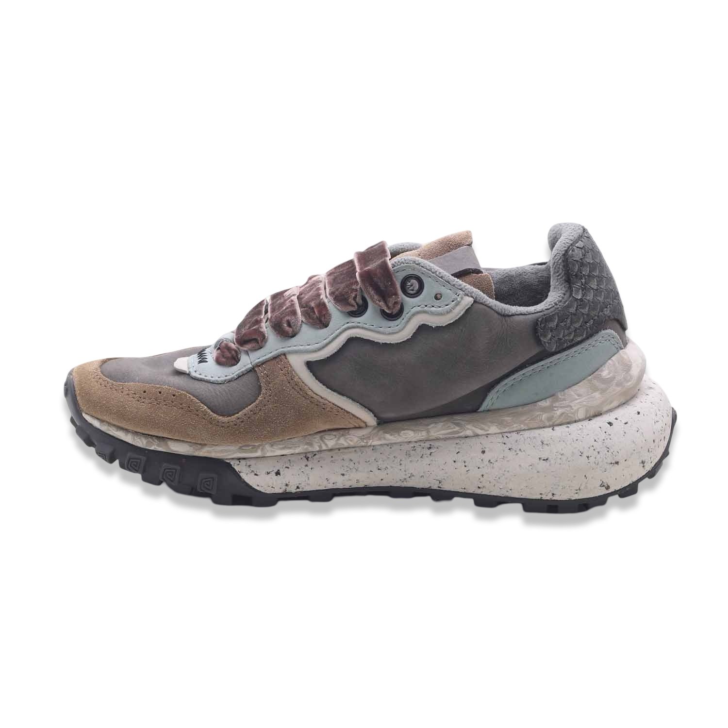 Sneaker dal design distintivo che fonde stile urbano e spirito outdoor. La tomaia multistrato mescola materiali di qualità come suede, pelle e tessuto tecnico.