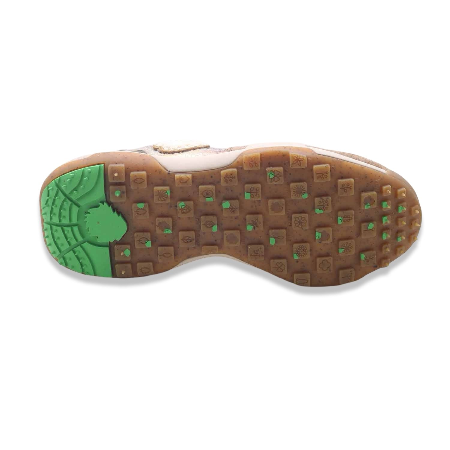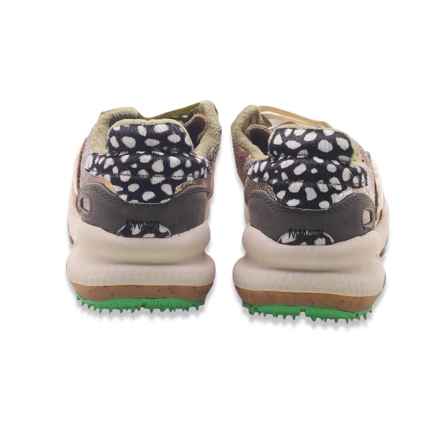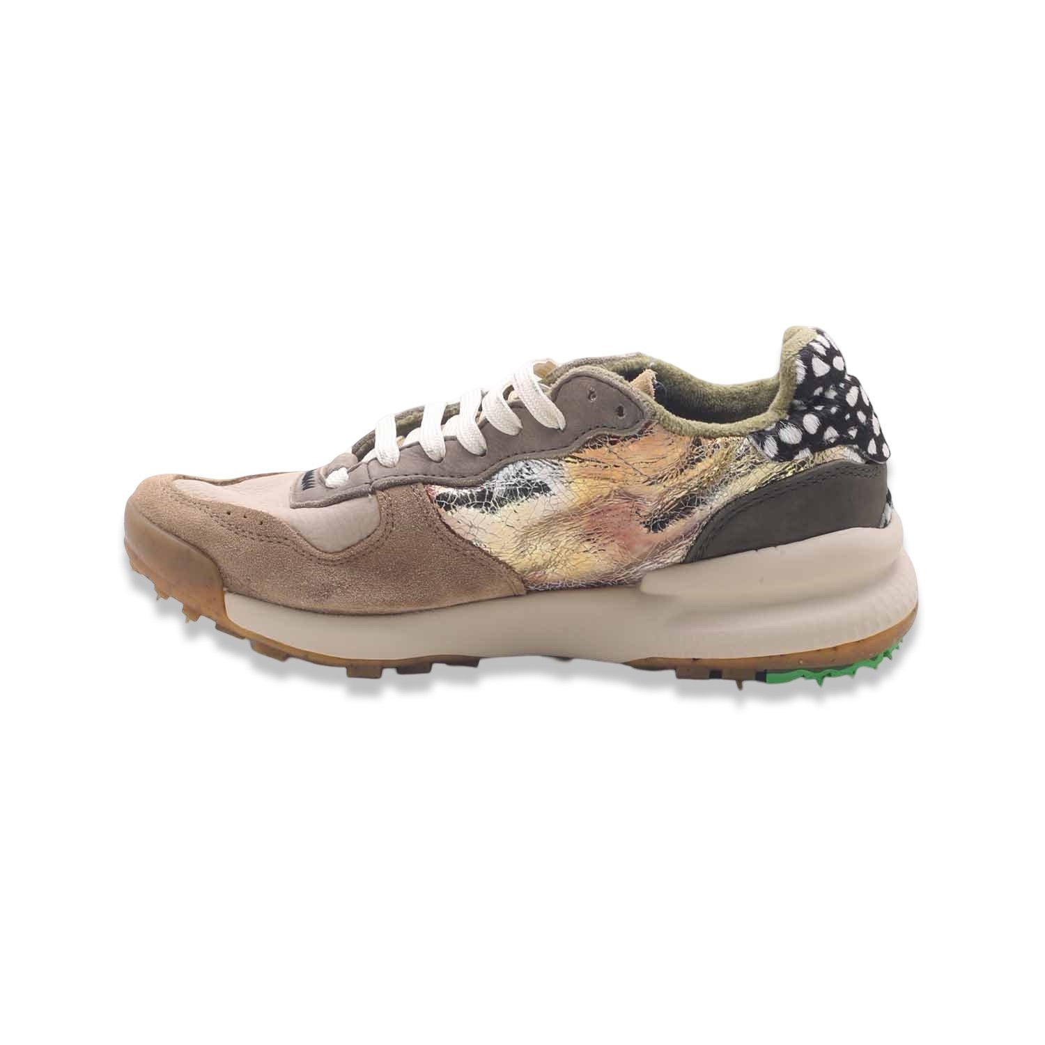 Sneaker unica nel suo genere, la Premium Sandy di Satorisan è un mix perfetto tra creatività artigianale e comfort avanzato. Il design è fortemente espressivo grazie alla palette colori calda e ai materiali contrastanti. Ogni scarpa presenta lacci differenti (uno chiaro, uno verde oliva in velluto), sottolineando l’identità libera e non convenzionale del brand.