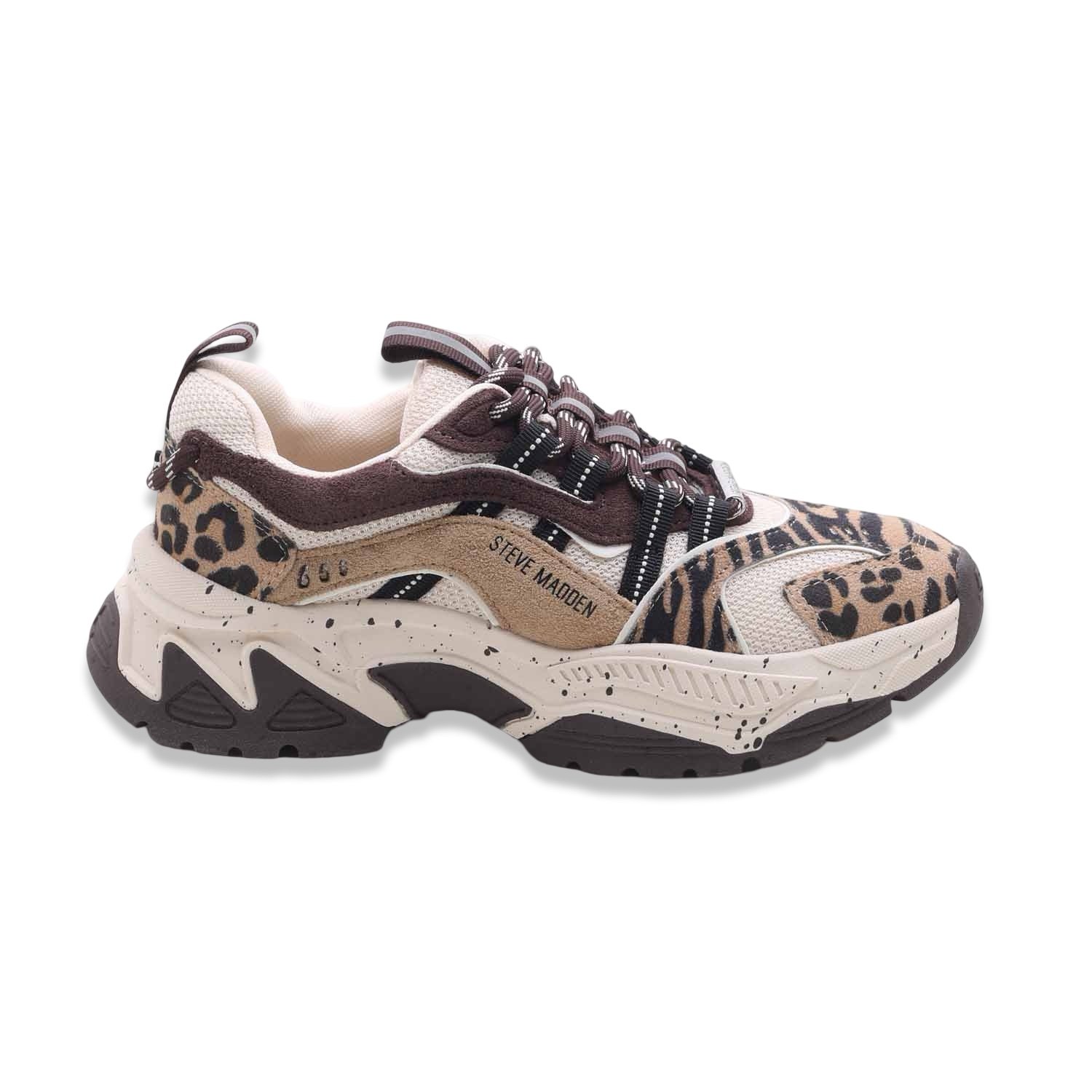 Le sneakers Steve Madden Animates sono il mix perfetto di stile urbano e carattere deciso. Questo modello chunky dal design audace presenta una tomaia multistrato in tessuto e suede con stampa animalier leopardata e dettagli in tonalità naturali e marroni, creando un look dinamico e trendy.
