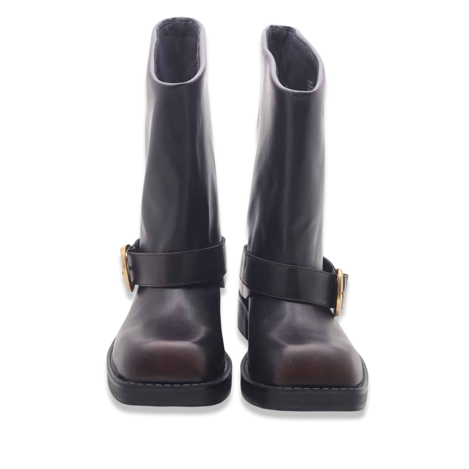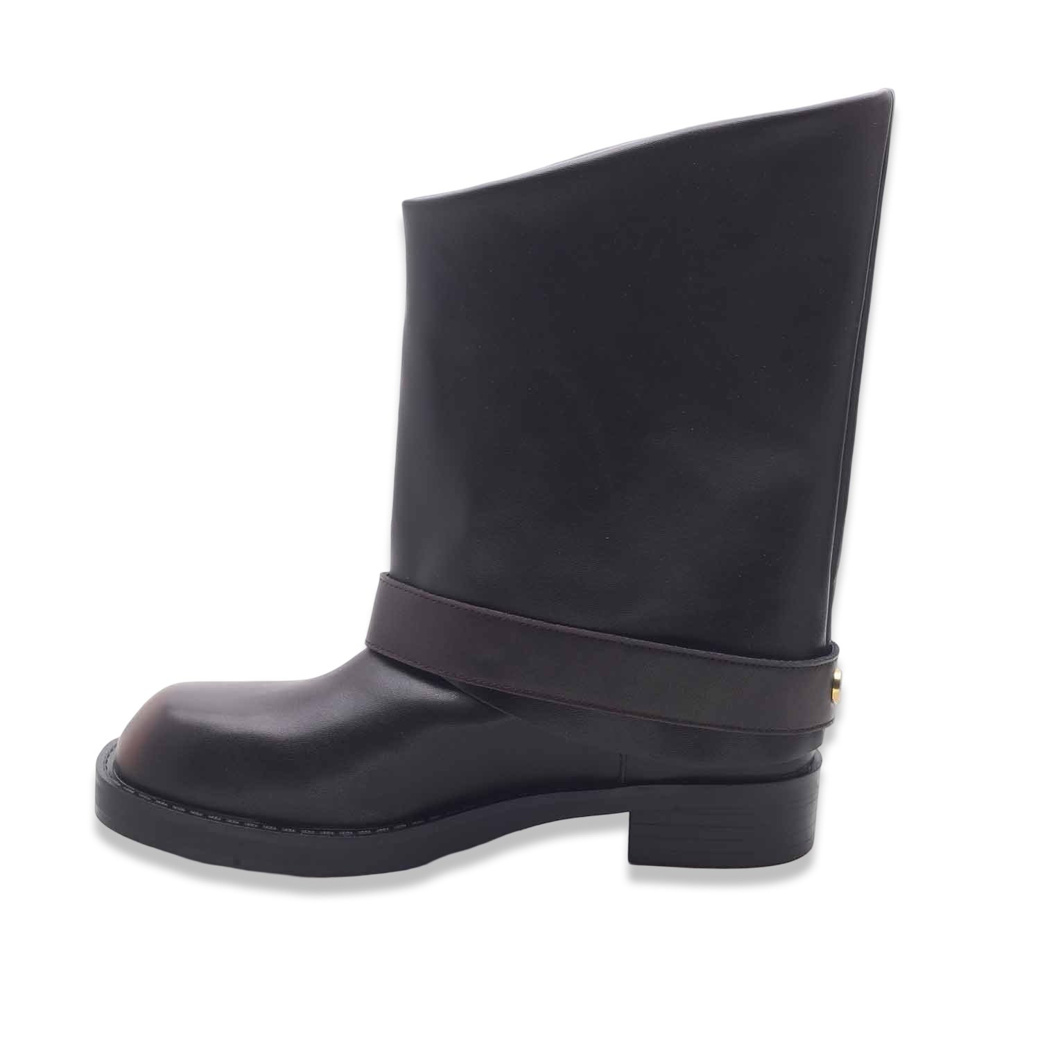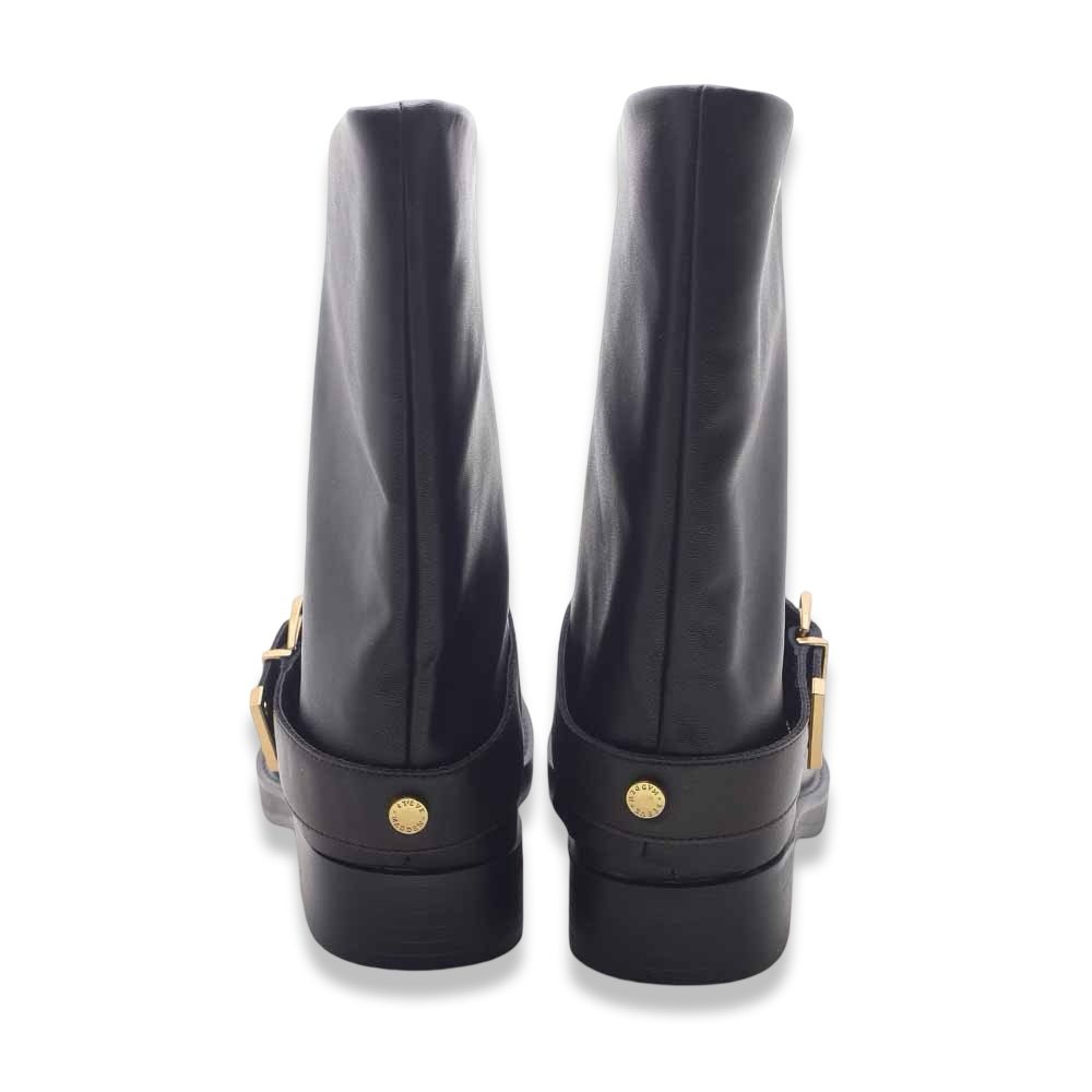 La punta arrotondata e la suola piatta garantiscono comfort, mentre il design deciso li rende perfetti per completare outfit casual con jeans skinny o look più audaci con gonne e abiti.