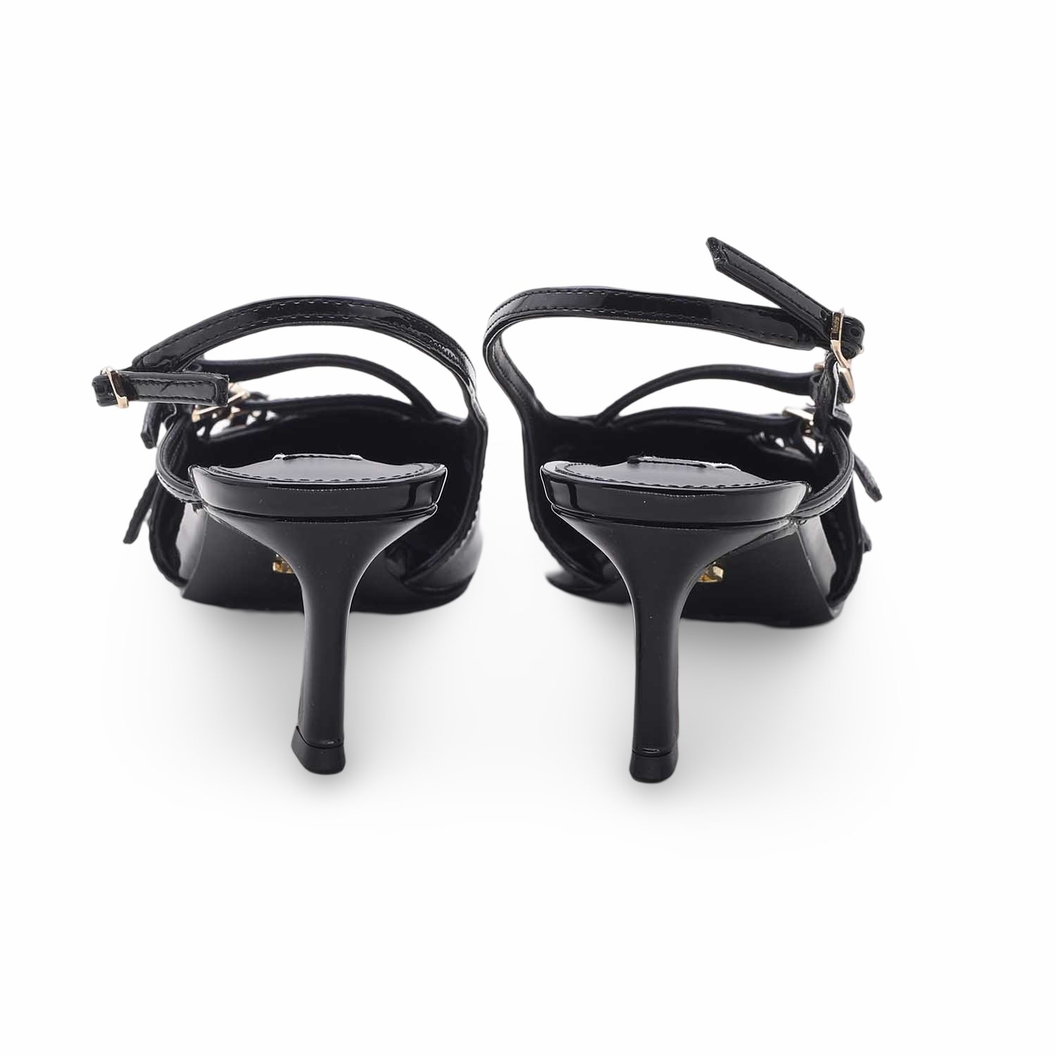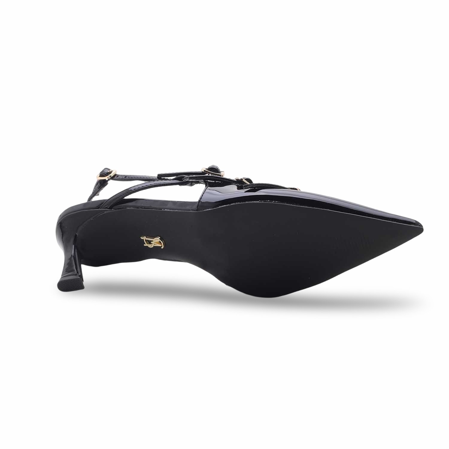 Realizzate in materiale sintetico lucido effetto vernice, esaltano ogni passo con la loro finitura brillante e i dettagli a cinturino regolabile che avvolgono il piede con un design originale e deciso. Il tacco a spillo di 7 cm dona slancio alla silhouette mantenendo una calzata stabile, ideale per muoversi con sicurezza dalla mattina fino a notte fonda.