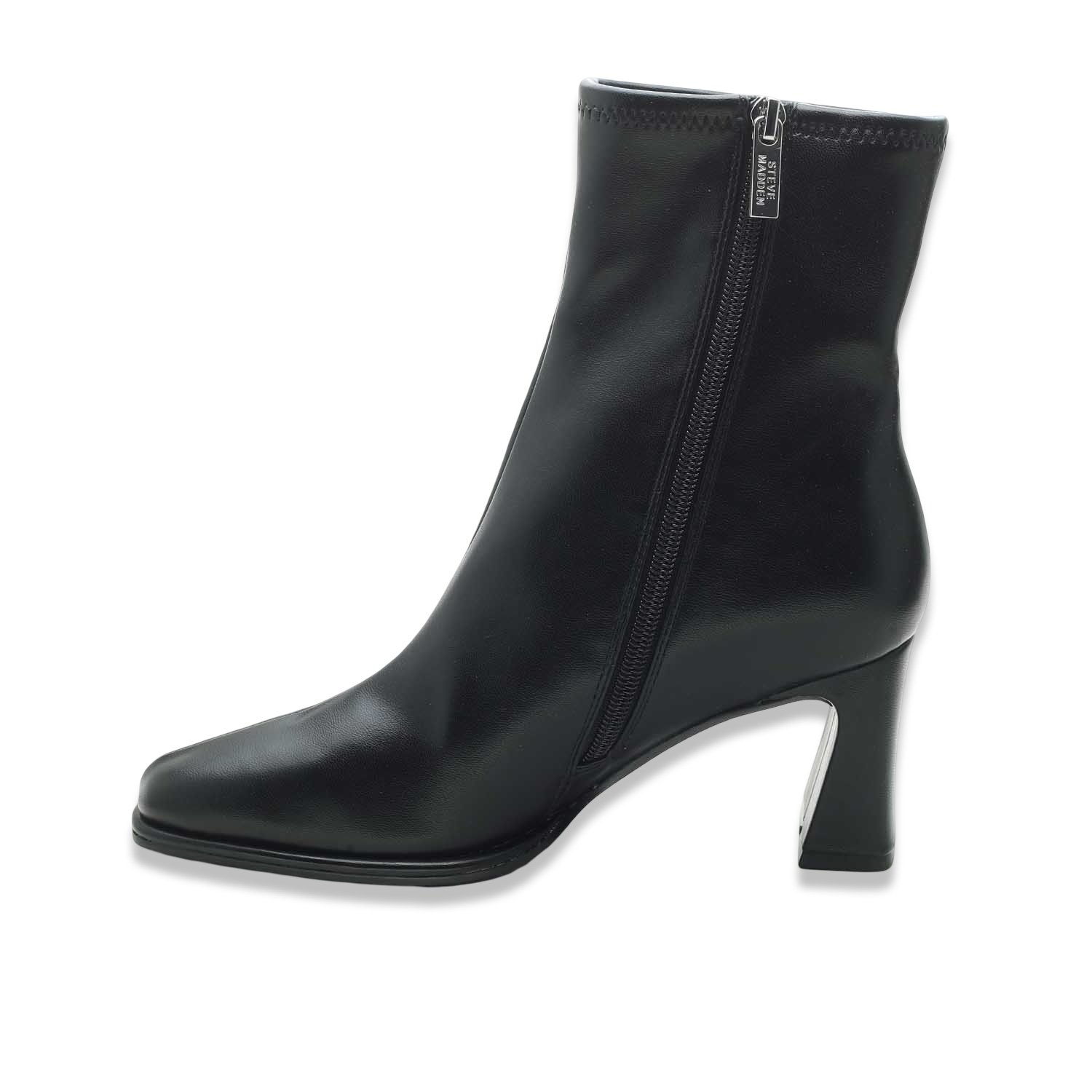 Il design avvolgente si adatta perfettamente alla caviglia grazie alla zip laterale interna, facilitando la calzata e garantendo una tenuta impeccabile. Il tacco geometrico, stabile e bilanciato, slancia la figura con disinvoltura, mentre la suola in gomma assicura una camminata fluida e sicura su ogni superficie.