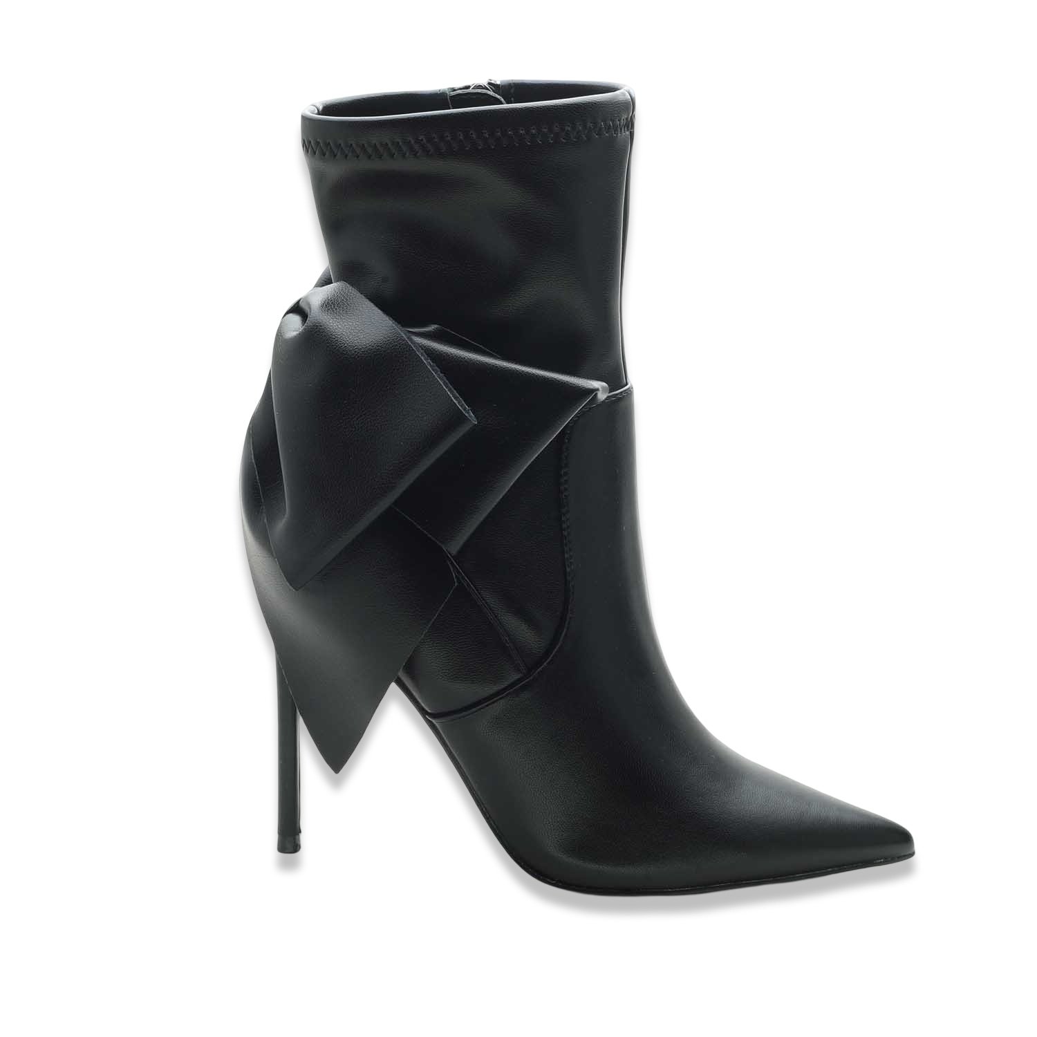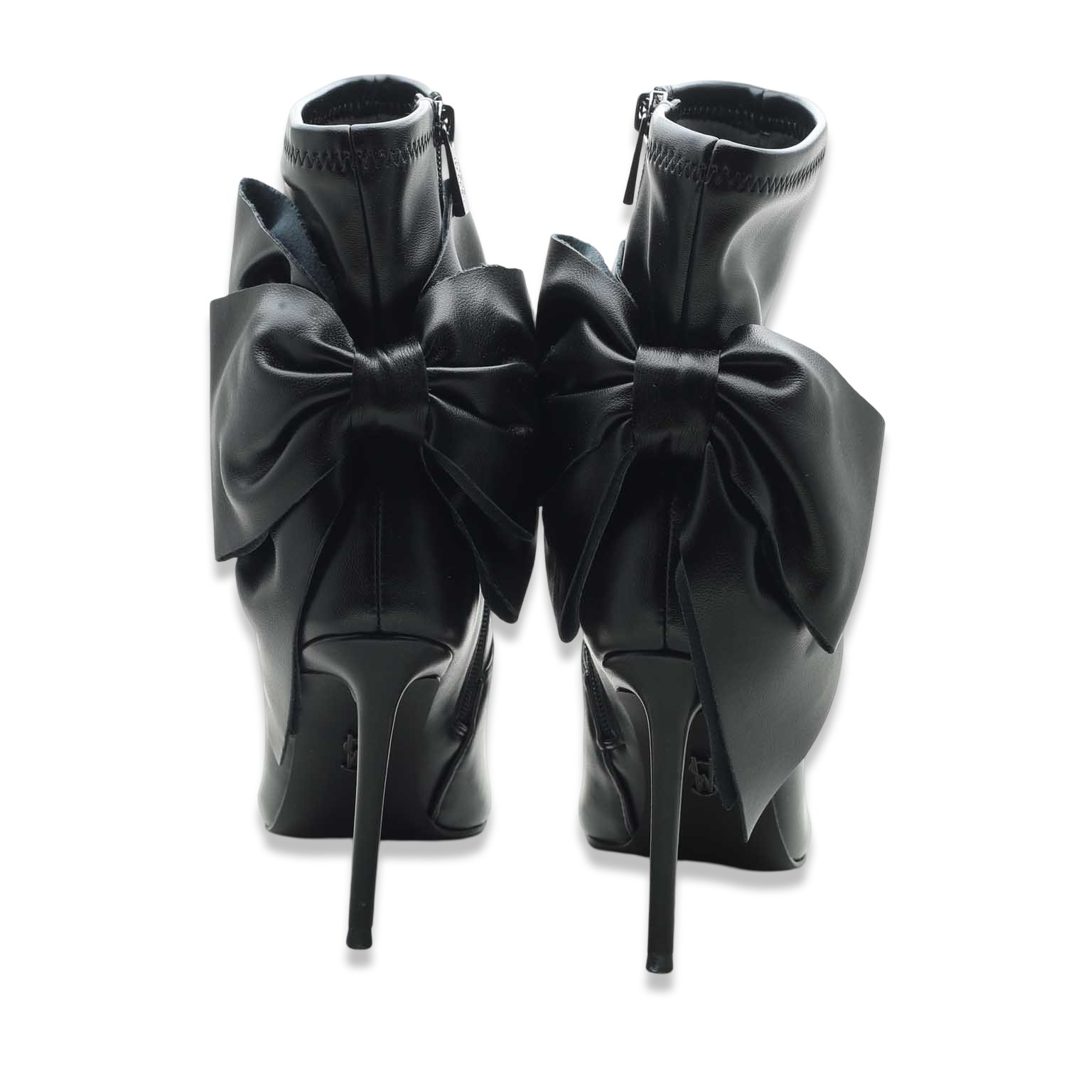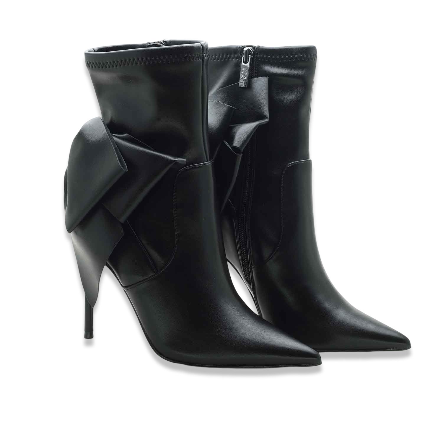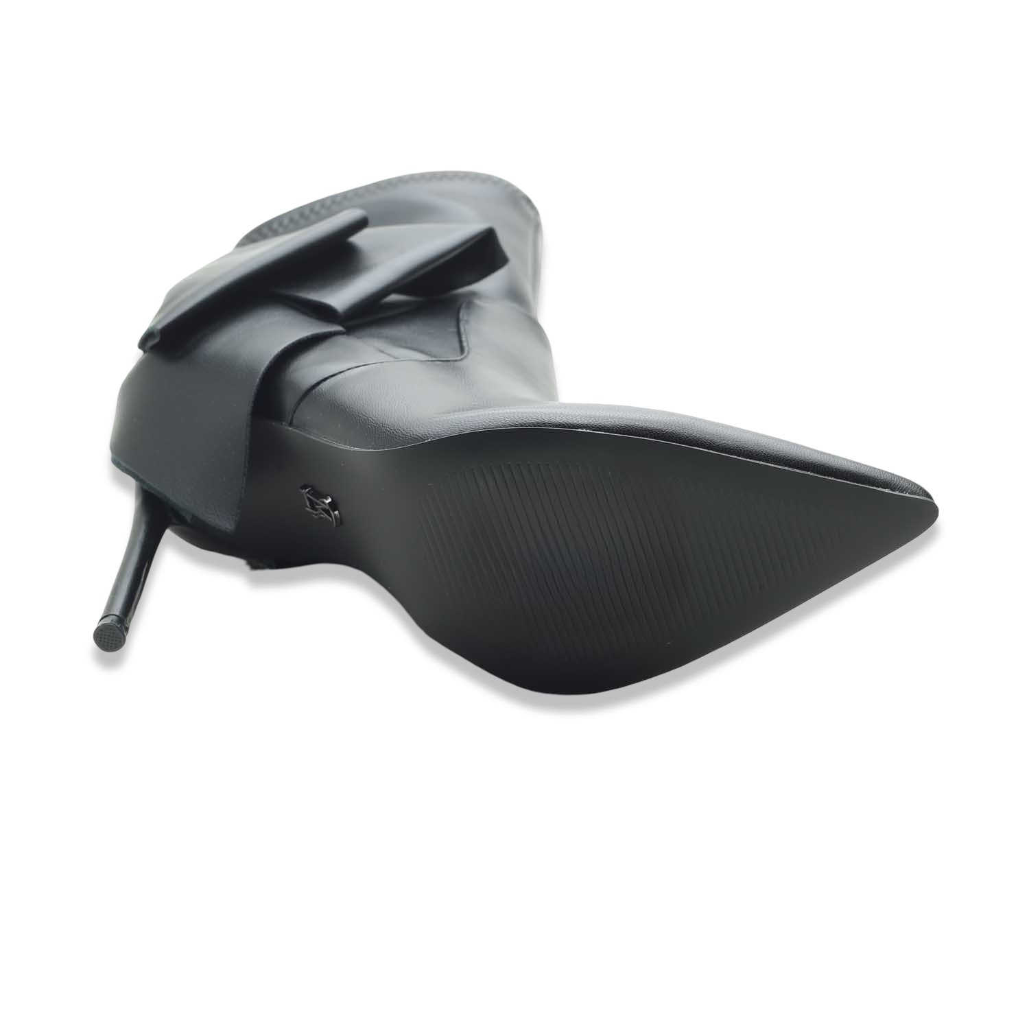 Realizzati in ecopelle nera di alta qualità, vantano una silhouette affusolata con punta sfilata e un tacco a stiletto che slancia la figura, donando grinta e sensualità al passo. La cerniera laterale garantisce una calzata comoda e sicura, mentre il dettaglio del fiocco in pelle aggiunge un tocco couture irresistibile.