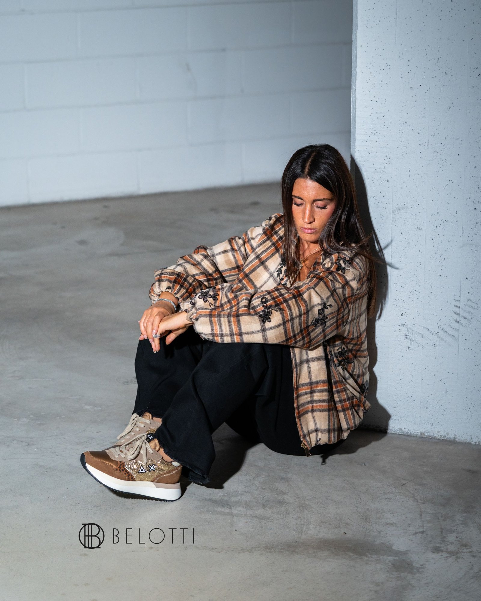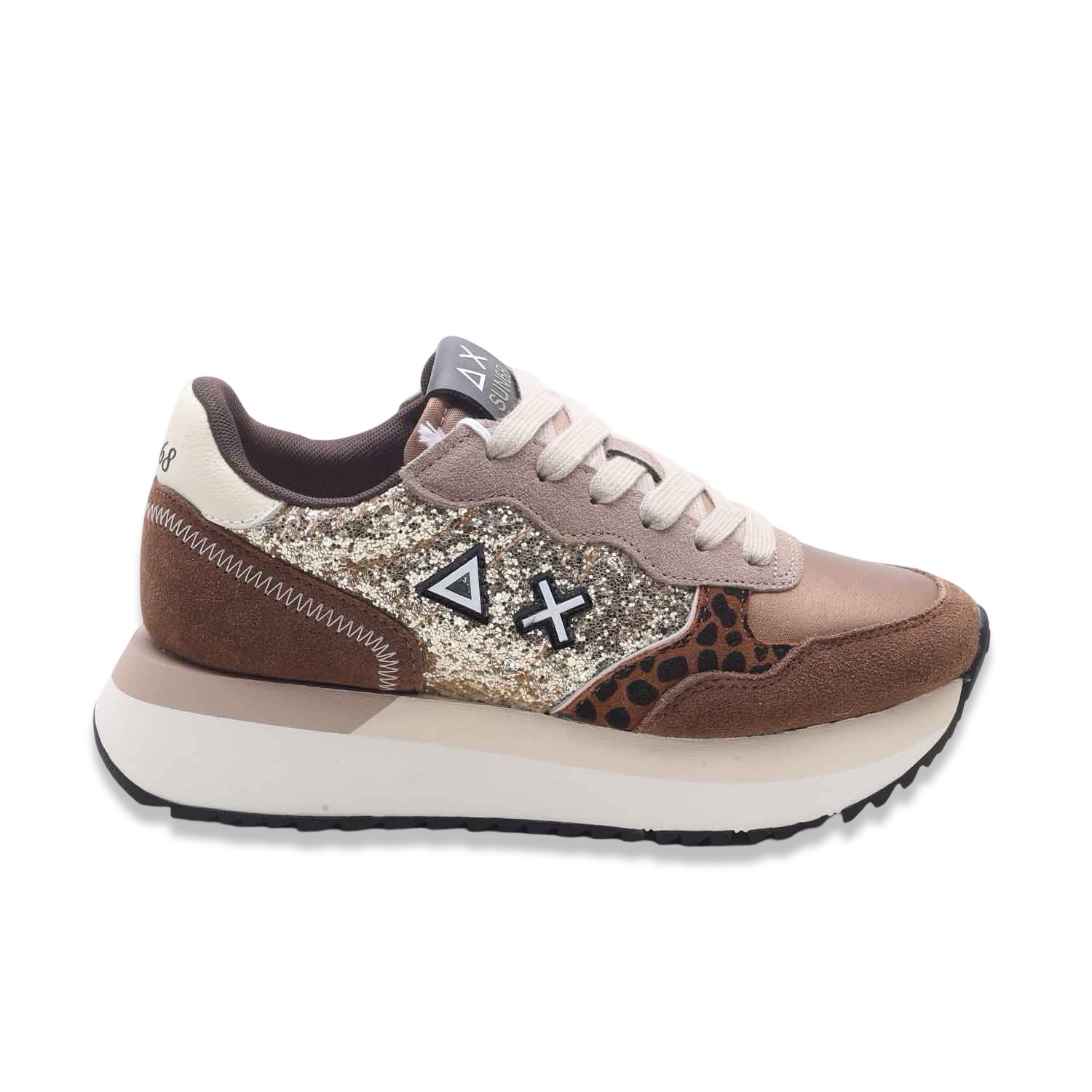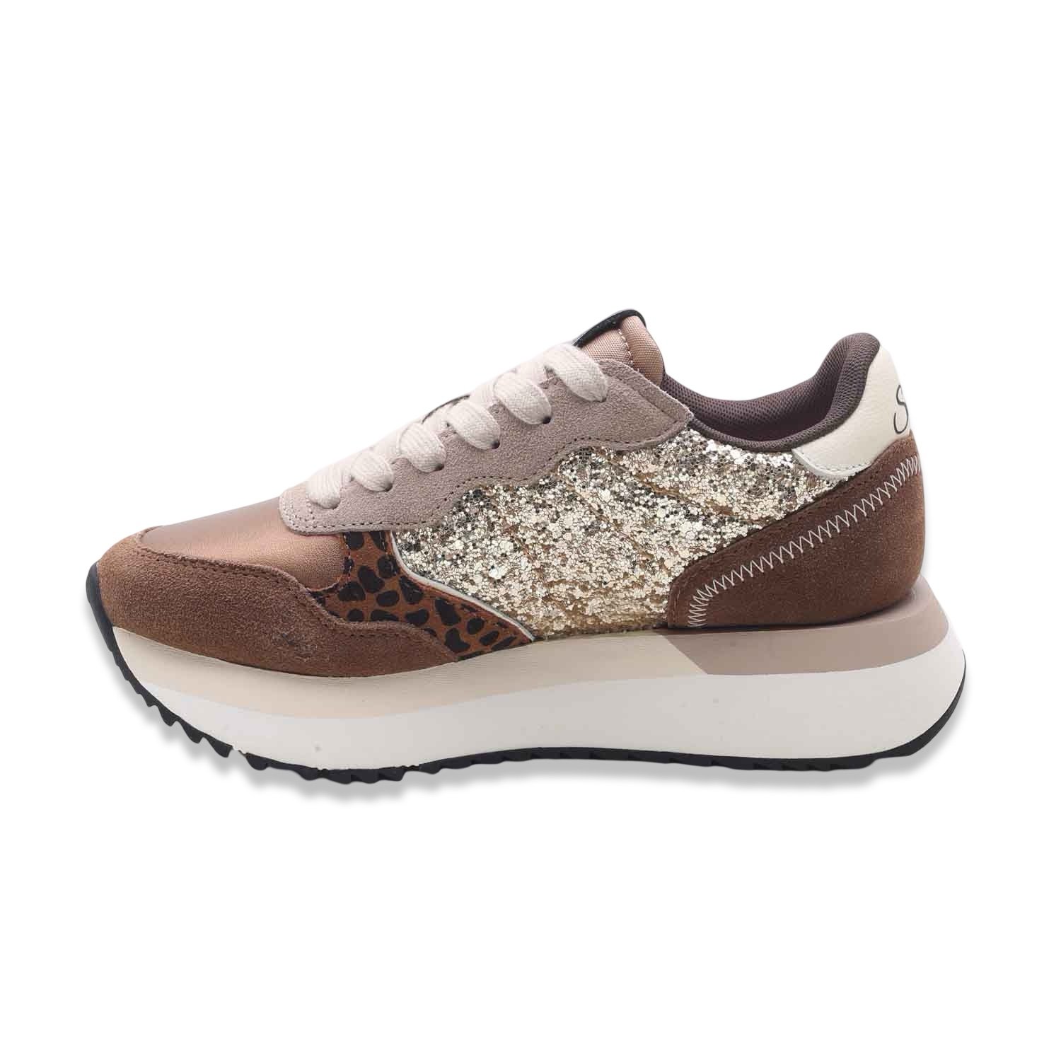 Una sneaker dallo stile grintoso e glamour che non passa inosservata. La tomaia combina materiali tecnici, suede e inserti glitterati oro e bronzo, impreziosita da dettagli animalier 🐆 per un look fashion e contemporaneo.