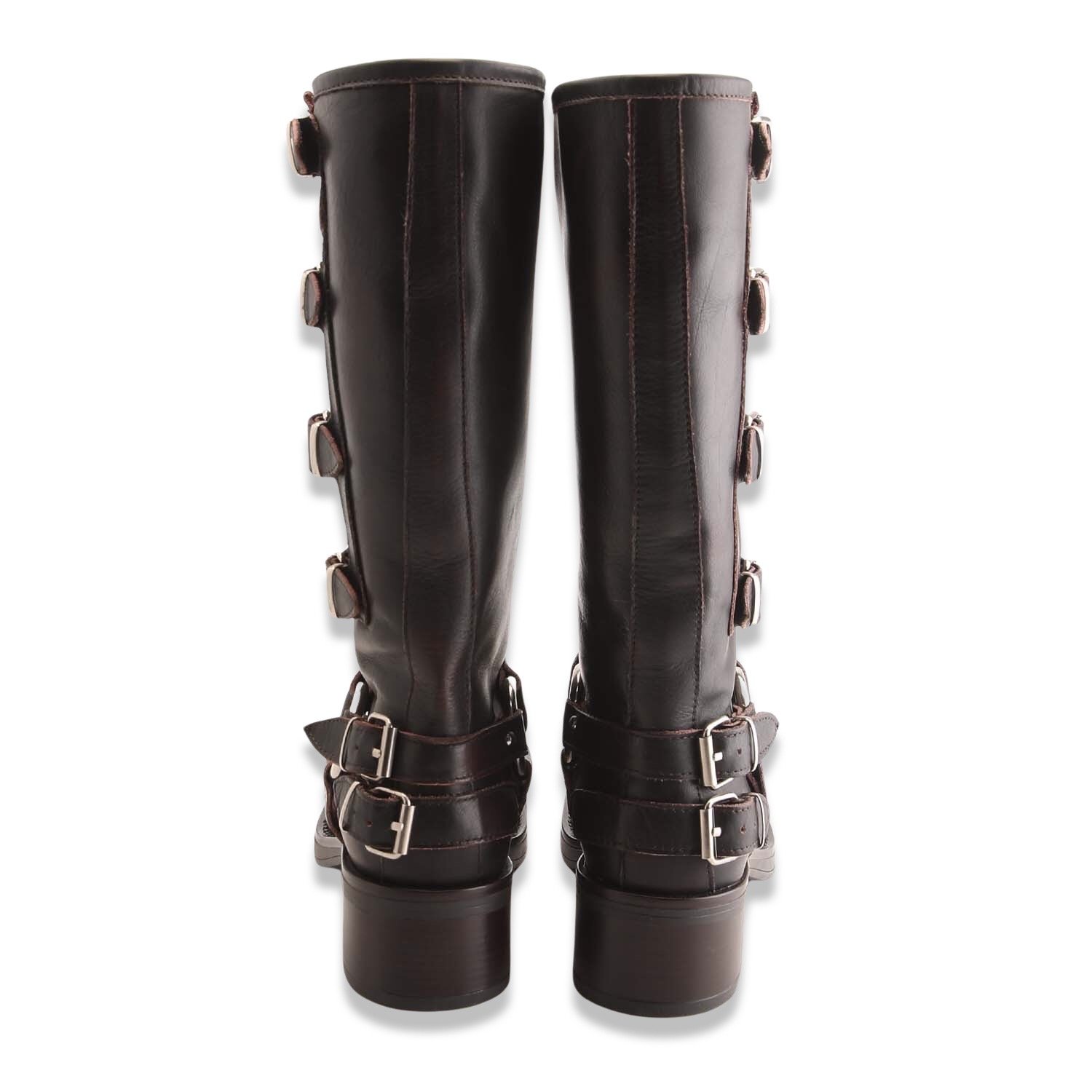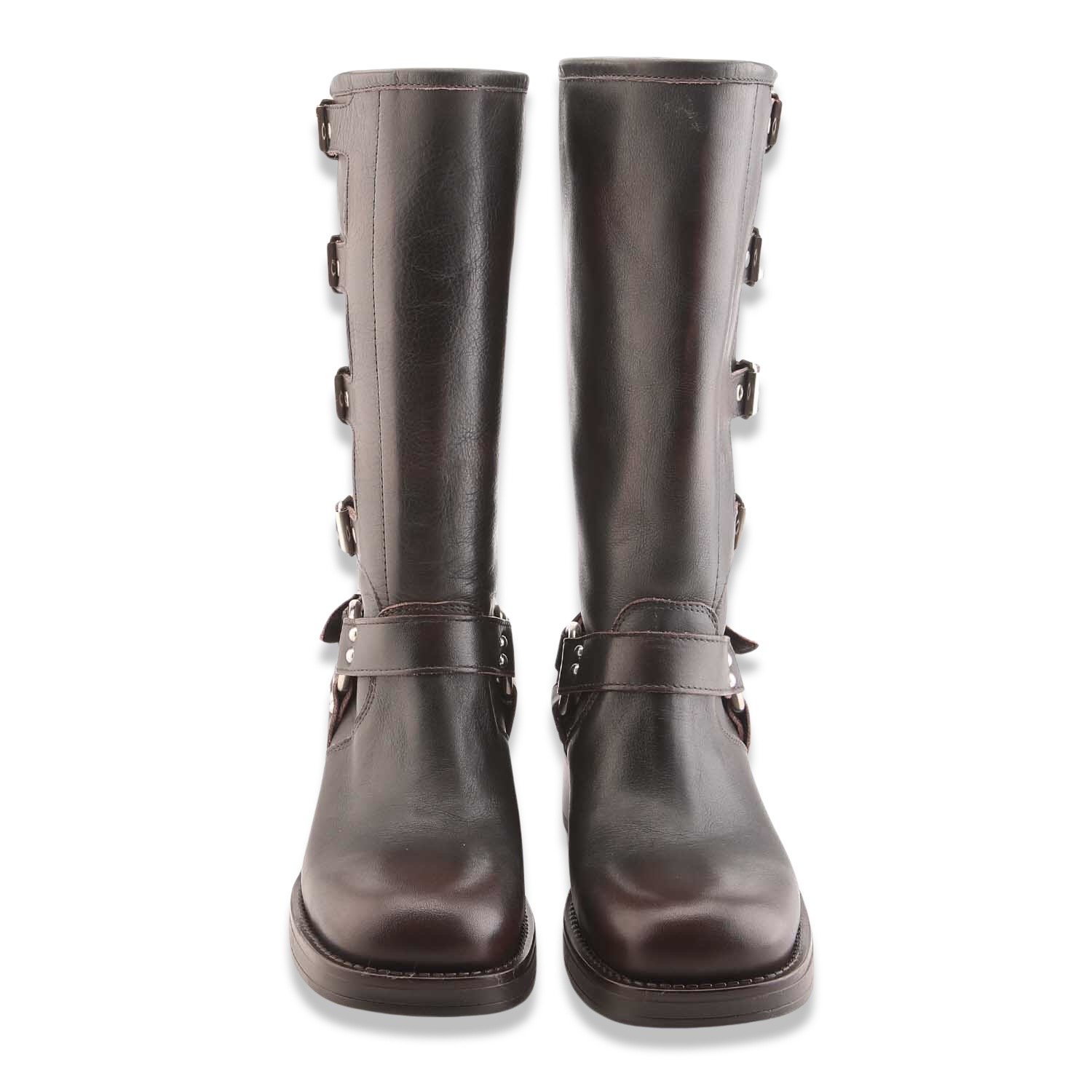 Realizzati in pregiata pelle color moro, si distinguono per la lavorazione artigianale e per i dettagli metallici che richiamano lo stile biker con un tocco luxury.