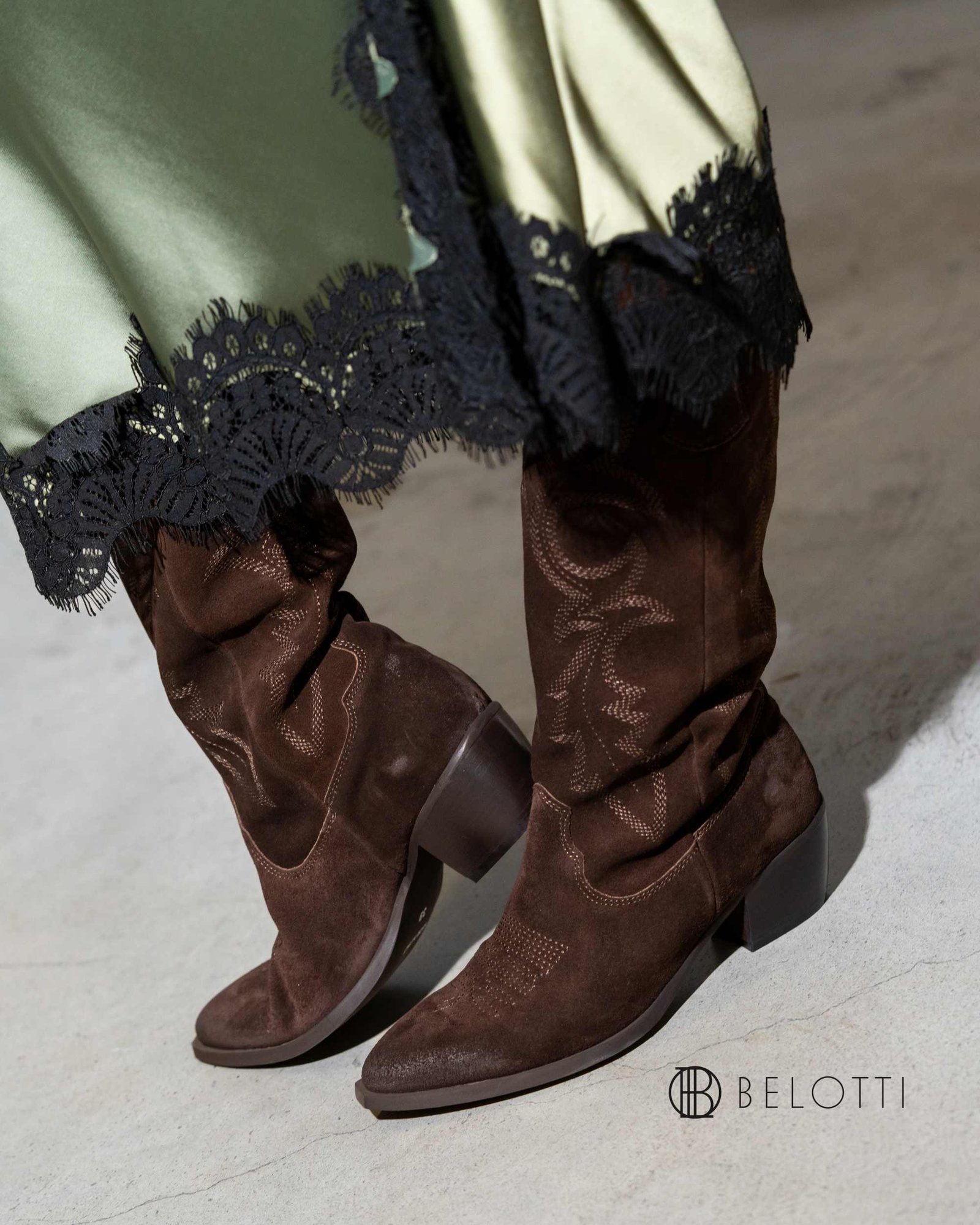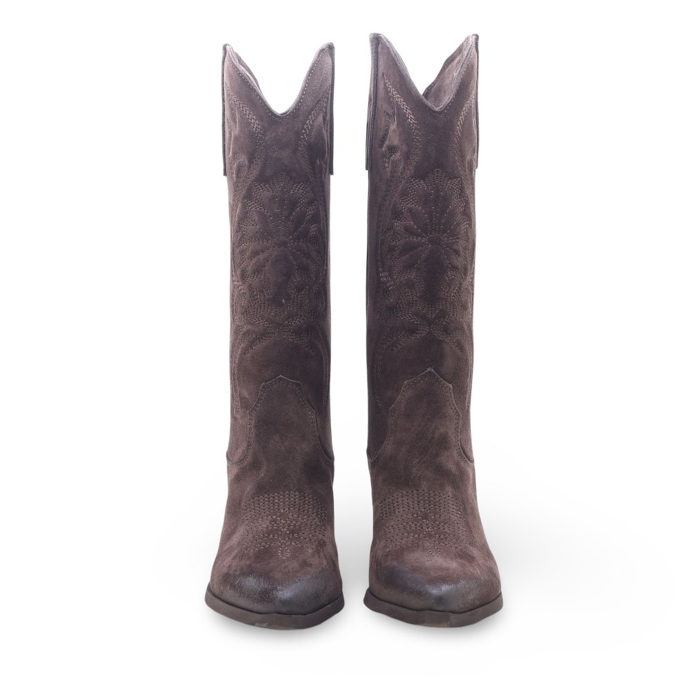 Un must-have per chi ama lo stile western chic 🤠✨. Realizzato in morbido camoscio color cioccolato, questo stivale alto sfoggia un ricamo decorativo tono su tono che percorre la gamba, creando un disegno elegante e raffinato.