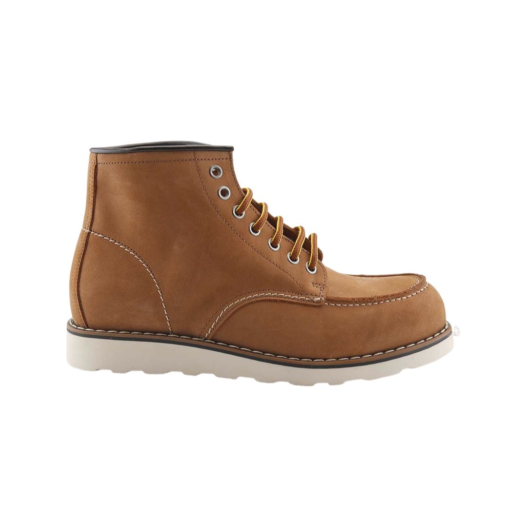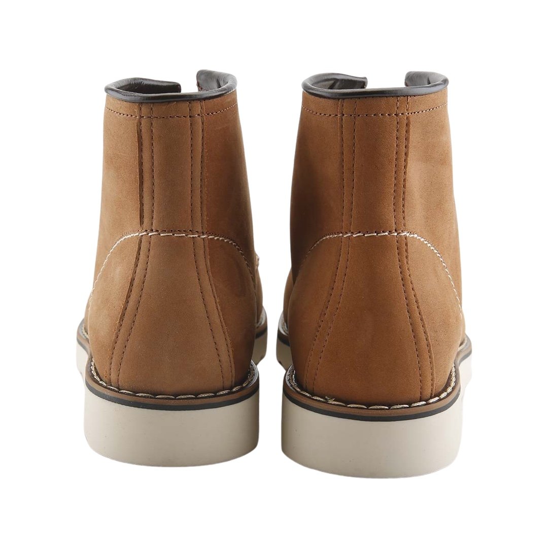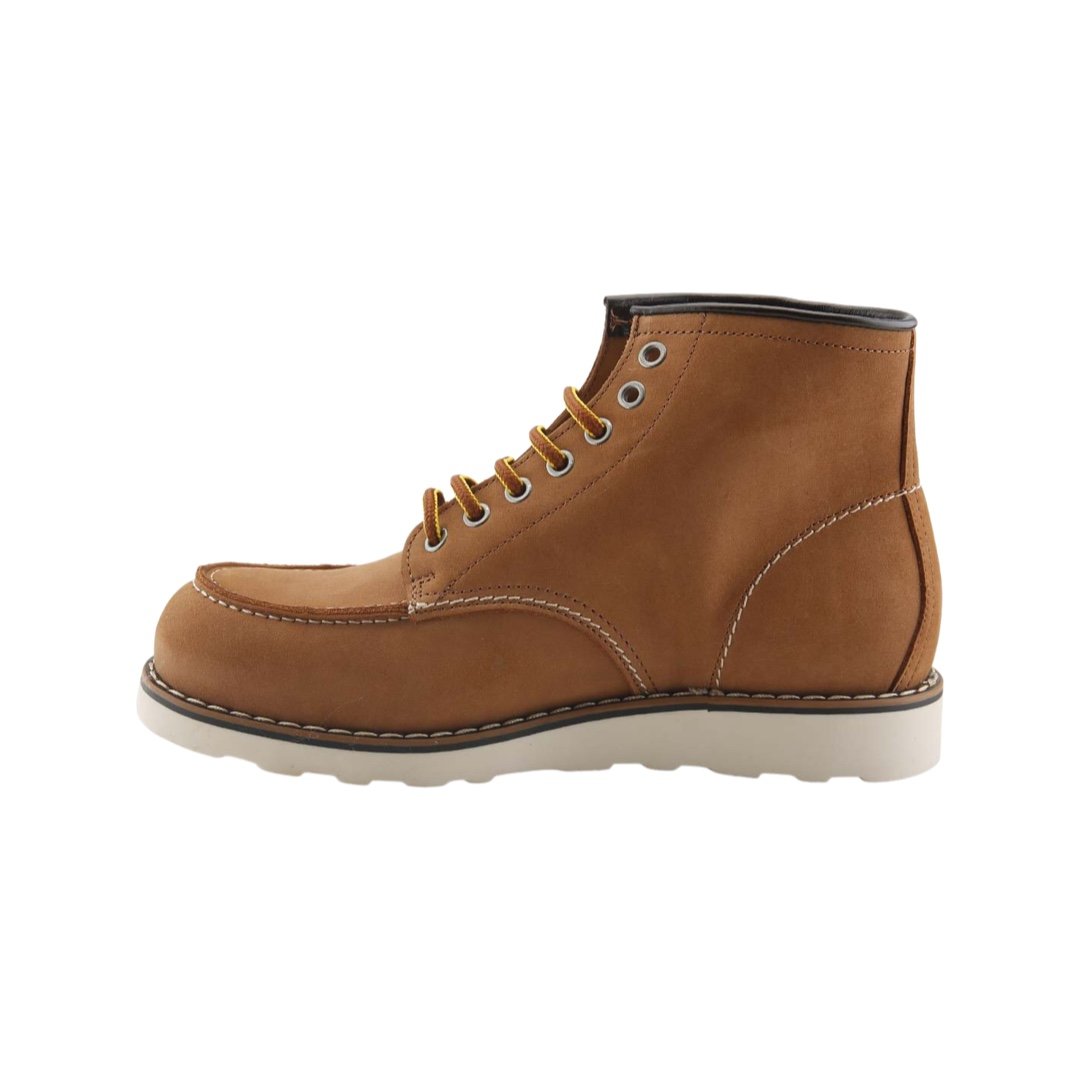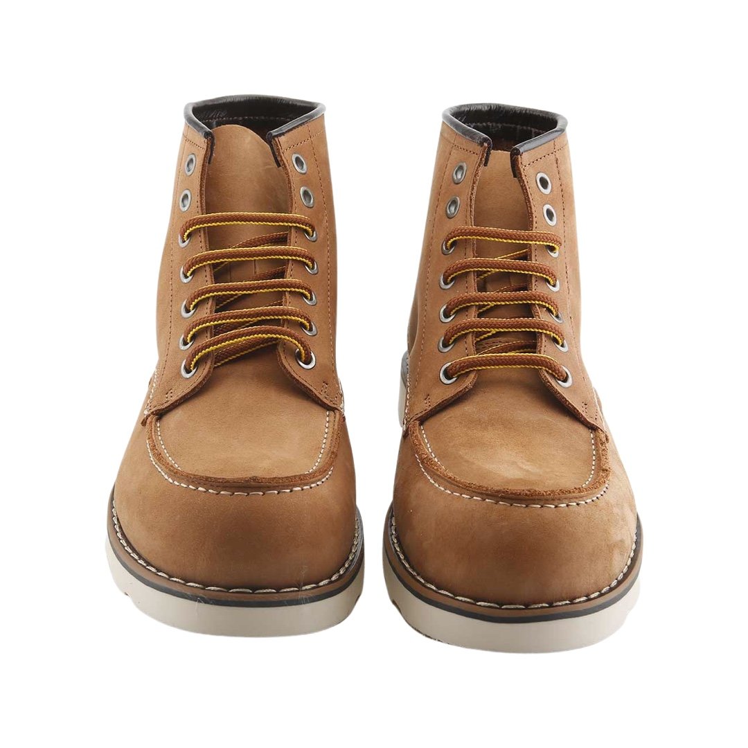Design: moc toe con cuciture evidenti, stile work-boot rivisitato