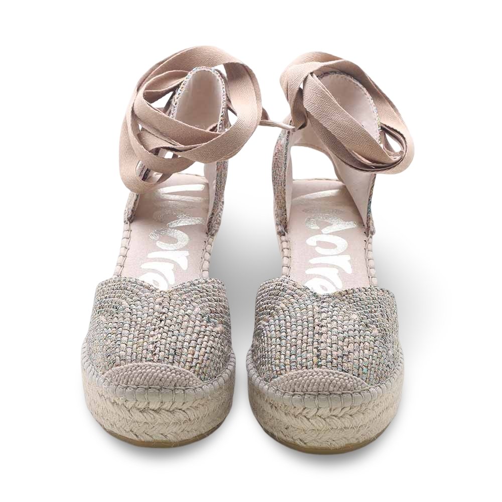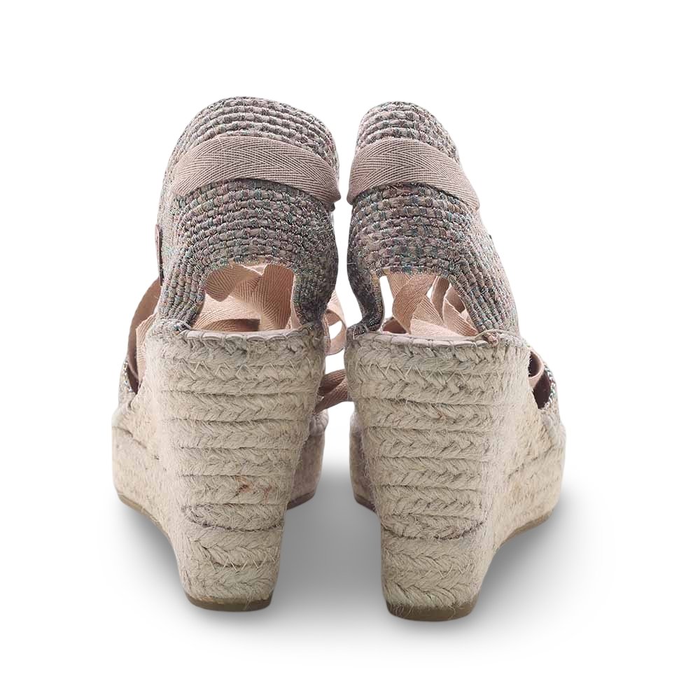 La tomaia intrecciata multicolor si abbina perfettamente alla zeppa in corda naturale, per un look fresco e raffinato. Il cinturino a nastro da annodare alla caviglia aggiunge un tocco romantico e femminile, mentre la suola flessibile garantisce stabilità e comfort per tutto il giorno.