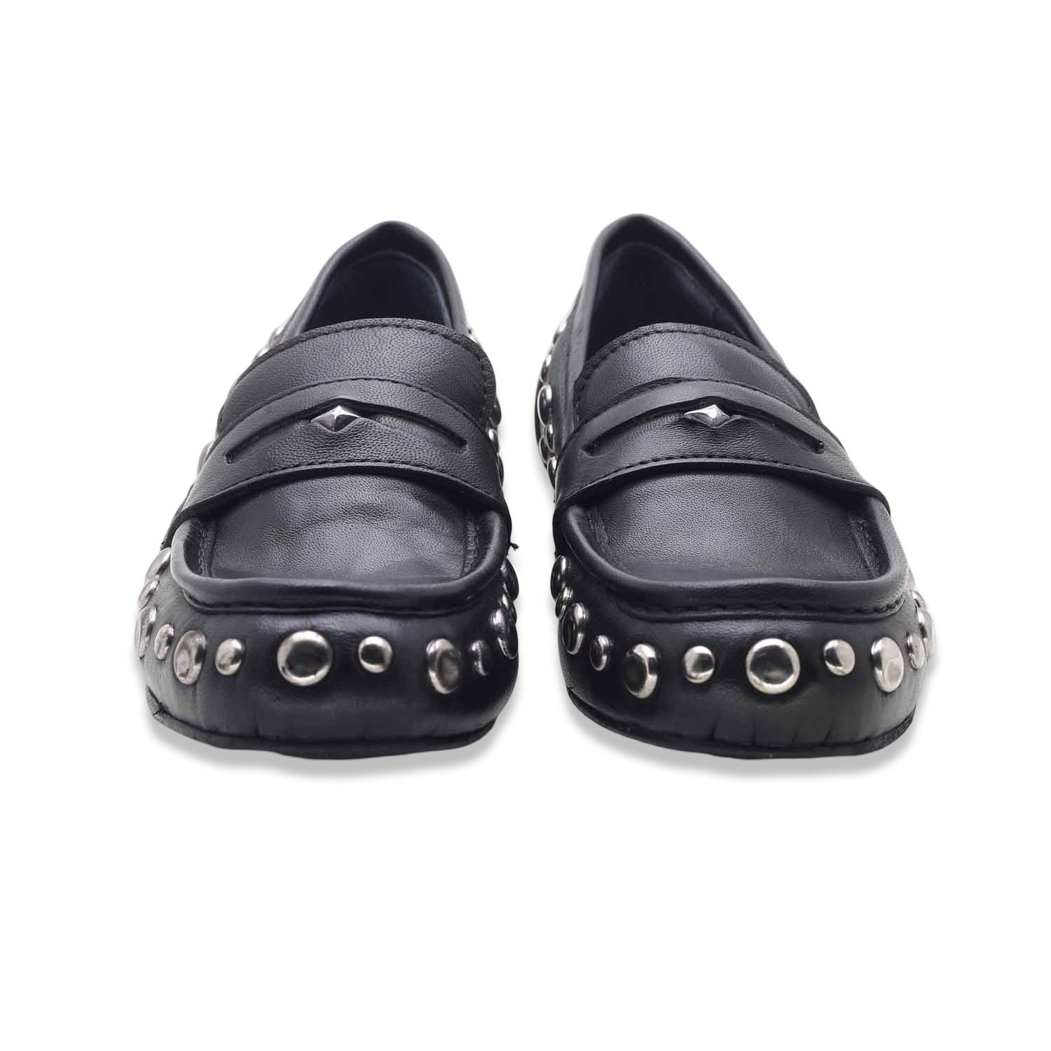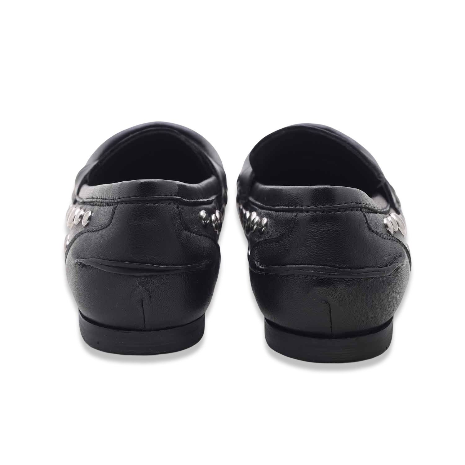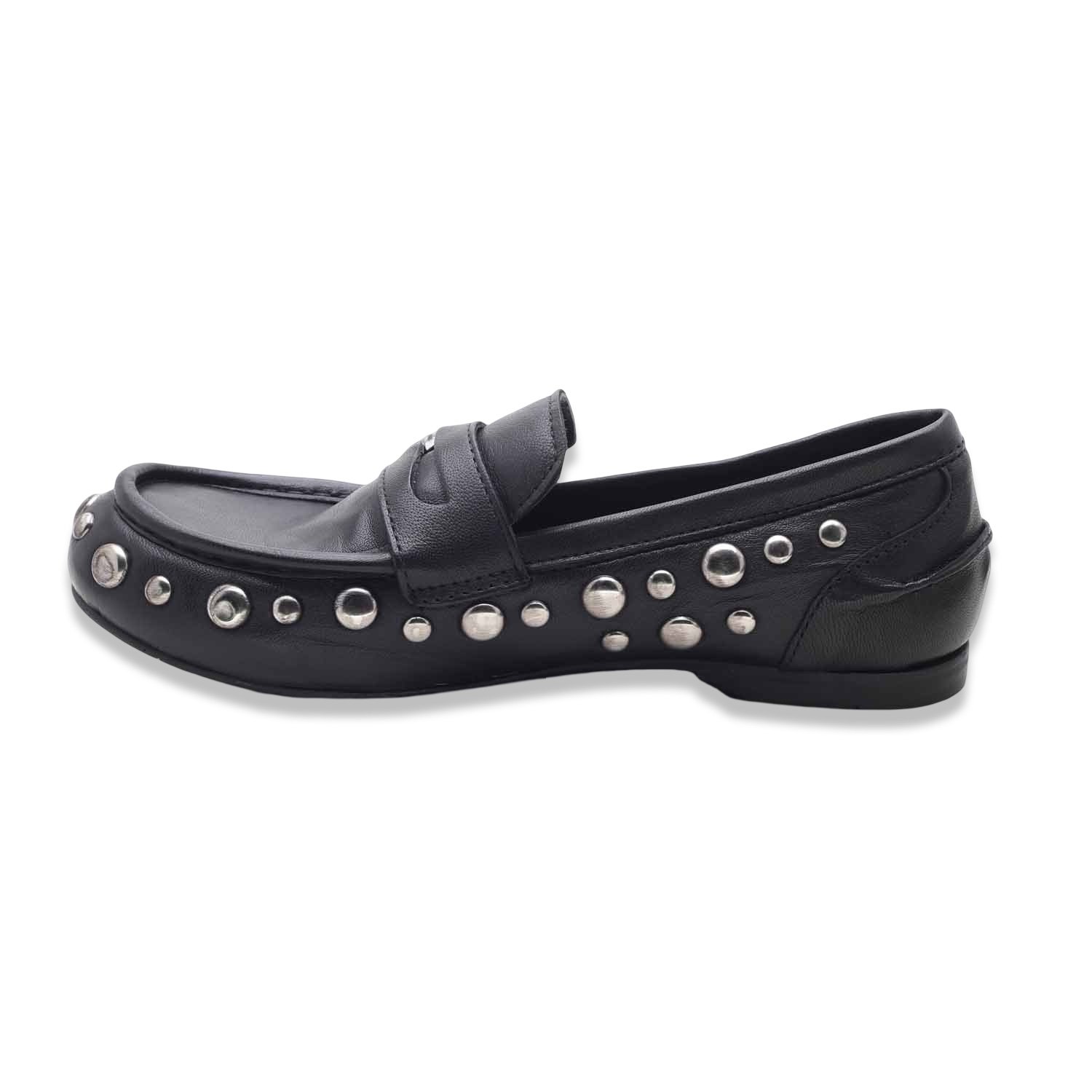Un mocassino dal carattere deciso che combina l’eleganza classica alla grinta dei dettagli metallici. Realizzato in pelle nera, è arricchito da borchie argentate lungo il profilo che ne sottolineano il design contemporaneo. La suola piatta garantisce comodità e praticità per l’uso quotidiano.